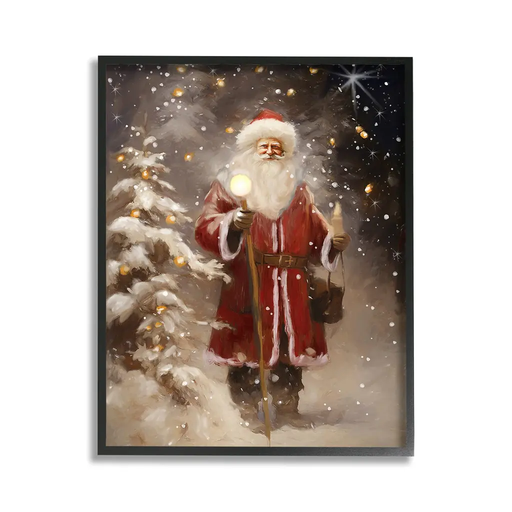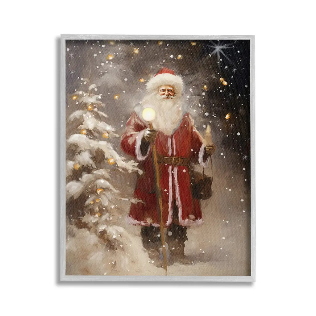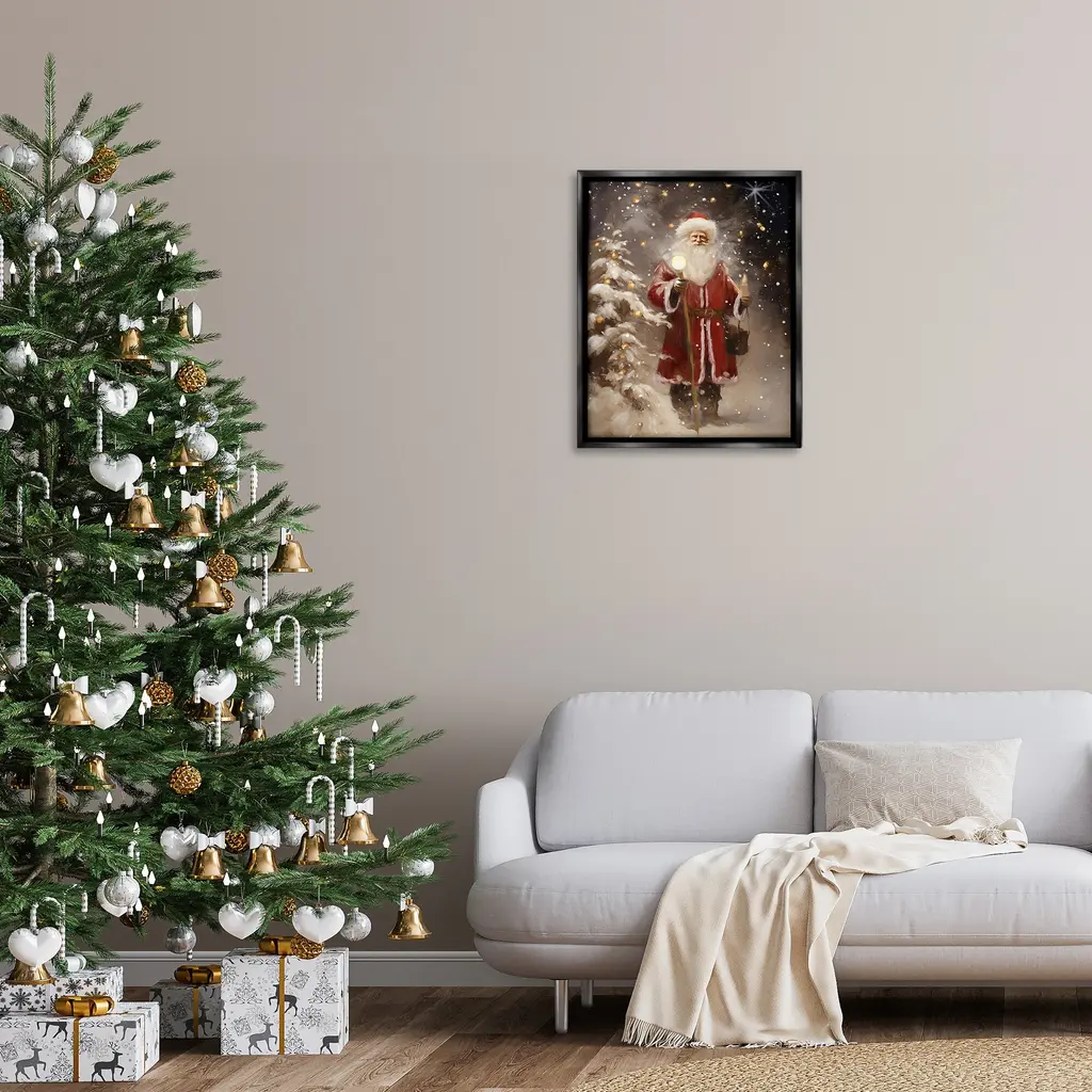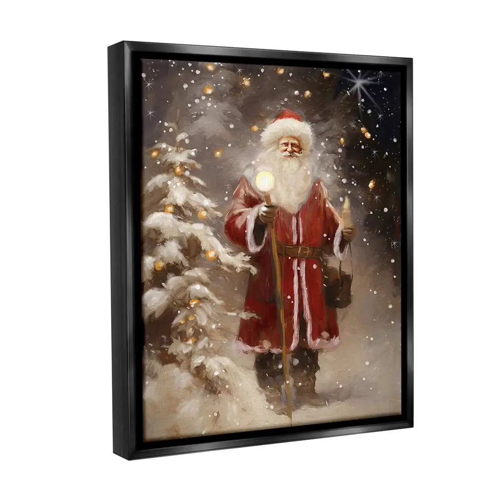 Elevate your home or office to the next level with Stupell Framed Floating Canvas Wall Art. Our premium hand-stretched canvas is mounted securely into a sturdy lightweight frame. The museum-style gap between the wrapped canvas and the box frame gives the illusion of floating artwork. Stupell Wall Art is made in the USA.Features: Dimensions: 17 x 1.7 x 21 Frame, 16 x 1.5 x 20 Canvas ArtFloating Frame Canvas Products are available in sizes 17"x21" and 25"x31". All Floating Frame Canvas Products have a 1.7" Depth.Wall Art is Ready to Hang with Hardware Free Hanging. No Installation required. For Easy Set Up Lean or Layer Artwork on Shelf or Against Wall. Artwork is Permently Fixed into the Frame.Our elevated 1.7" Thick Floating Frame is the perfect complement to our canvas style Wall Art. We use only the highest quality inks in house with industry leading printing solutions. Canvas is hand stretched over a durable wood foundation and then mounted securly into a Modern Box Frame. Made in the USA.Artwork Relates To: Christmas, Santa Claus, Person, Gift, Present, Holiday, Winter, Snow, Snowflake, Night, Ornament, Light, StarDesign by Ramona Murdock
