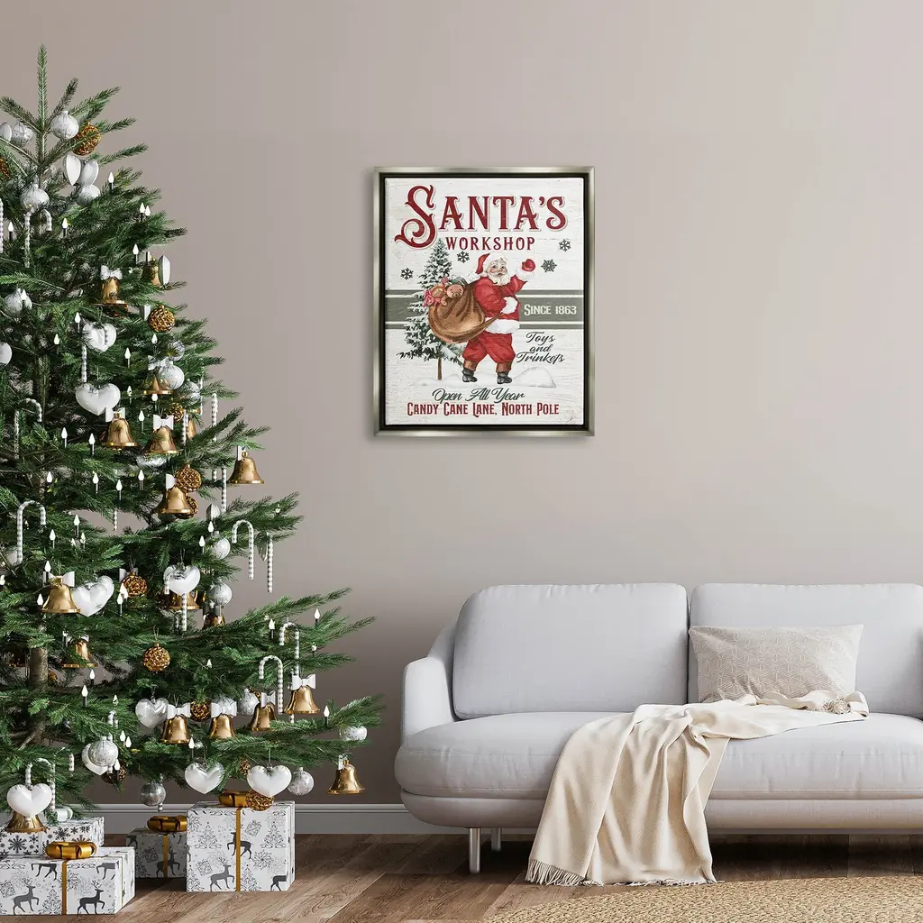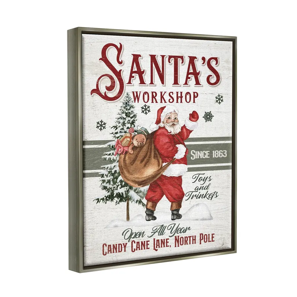 Elevate your home or office to the next level with Stupell Framed Floating Canvas Wall Art. Our premium hand stretched canvas is mounted securly into a sturdy lightweight frame. The museum style gap between wrapped canvas and box frame gives the illusion of floating artwork. Features: Dimensions: 17 x 1.7 x 21 Frame, 16 x 1.5 x 20 Canvas ArtFloating Frame Sizes Include Standard: 17 x 1.7 x 21 Oversized: 25 x 1.7 x 31Wall Art is Ready to Hang - No Installation or Hardware Needed. For Easy Set Up Lean or Layer Artwork on Shelf or Against Wall.Our elevated 1.7" Thick Floating Frame is the perfect complement to our canvas style Wall Art. We use only the highest quality inks in house with industry leading printing solutions. Canvas is hand stretched over a durable wood foundation and then mounted securly into a Modern Box Frame. Made in the USA.Artwork Relates To: Santa Claus, Holiday, Christmas, Seasonal, Snowflake, Snow, TreeDesign by Jo MoultonLiving Room, Den, Hallway, Office, Entryway, Study, Dining Room or Bed Room.Text Includes: Santa's Workshop. Open All Year. Candy Cane Lane. North Pole