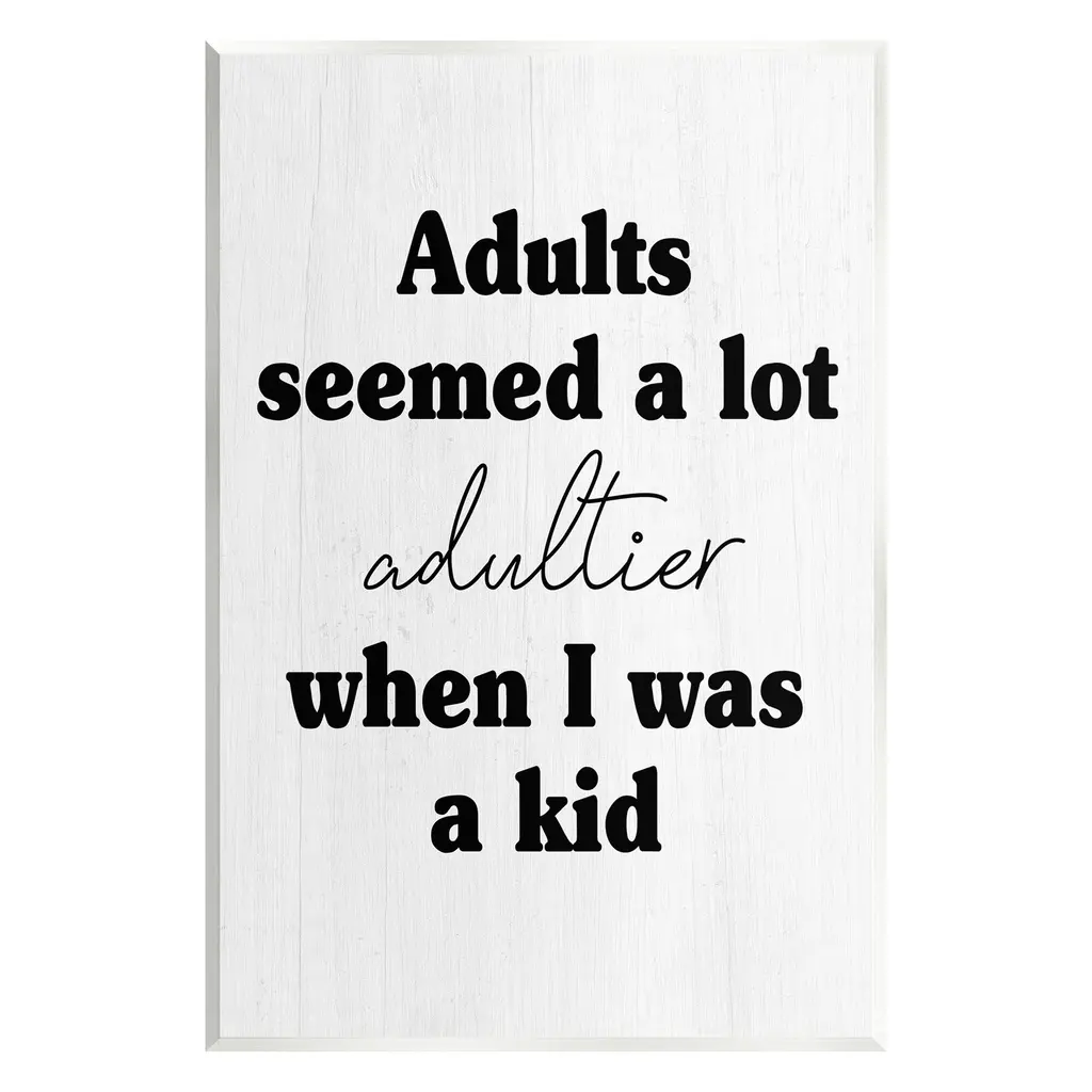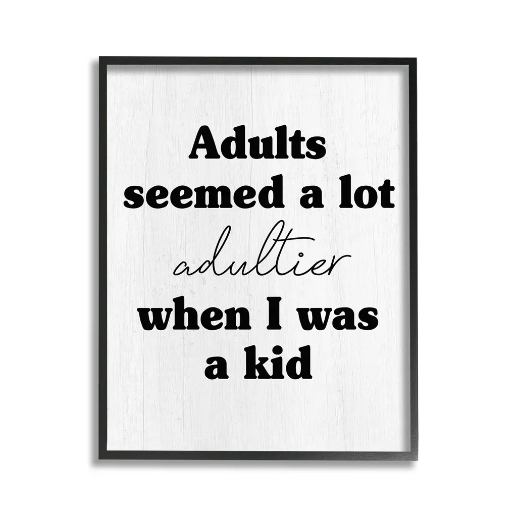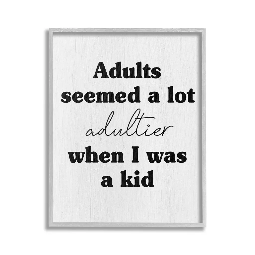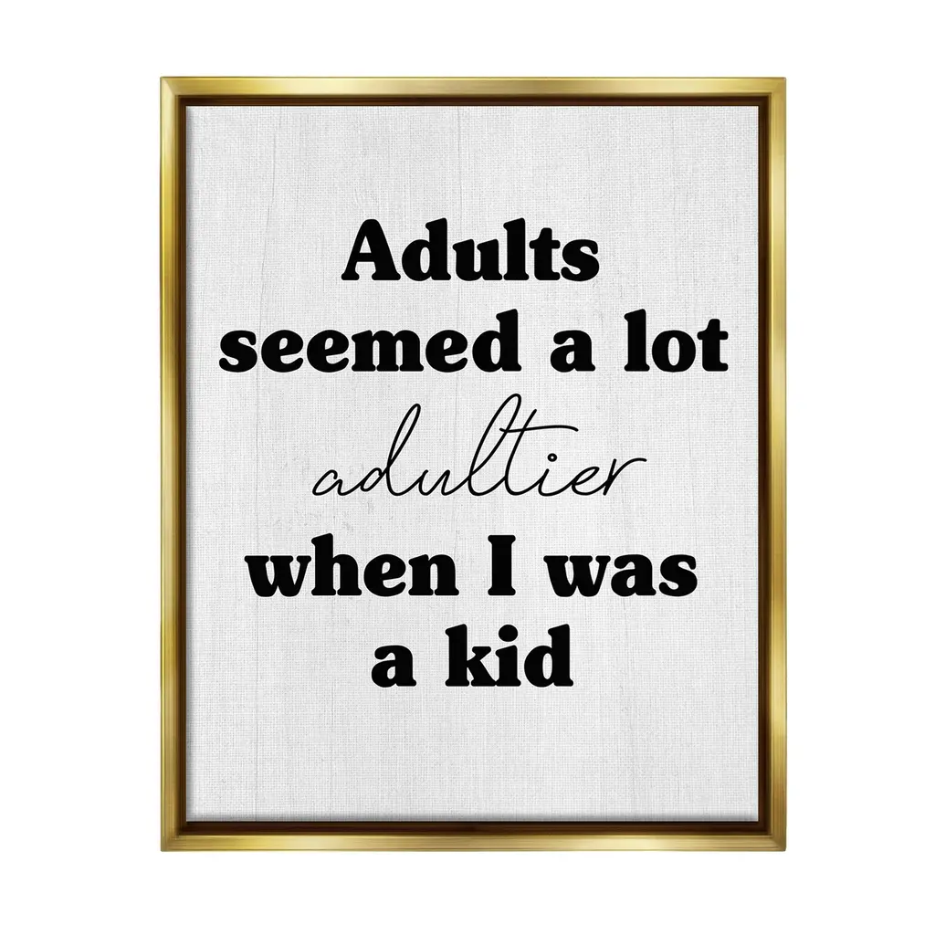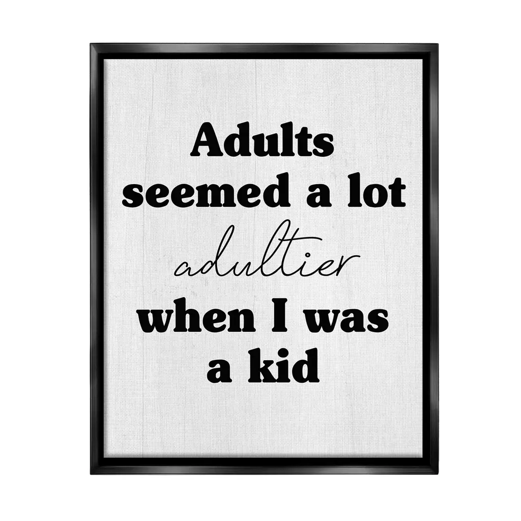 Elevate your home or office to the next level with Stupell Framed Floating Canvas Wall Art. Our premium hand-stretched canvas is mounted securely into a sturdy lightweight frame. The museum-style gap between the wrapped canvas and the box frame gives the illusion of floating artwork. Stupell Wall Art is made in the USA.Features: Dimensions: 17 x 1.7 x 21 Frame, 16 x 1.5 x 20 Canvas ArtFloating Frame Canvas Products are available in sizes 17"x21" and 25"x31". All Floating Frame Canvas Products have a 1.7" Depth.Wall Art is Ready to Hang with Hardware Free Hanging. No Installation required. For Easy Set Up Lean or Layer Artwork on Shelf or Against Wall. Artwork is Permently Fixed into the Frame.Our elevated 1.7" Thick Floating Frame is the perfect complement to our canvas style Wall Art. We use only the highest quality inks in house with industry leading printing solutions. Canvas is hand stretched over a durable wood foundation and then mounted securly into a Modern Box Frame. Made in the USA.Artwork Relates To: Phrase, Humor, Funny, Rustic, Sassy, Adults Seemed a lot Adultier When I was a KidDesign by Lil' Rue