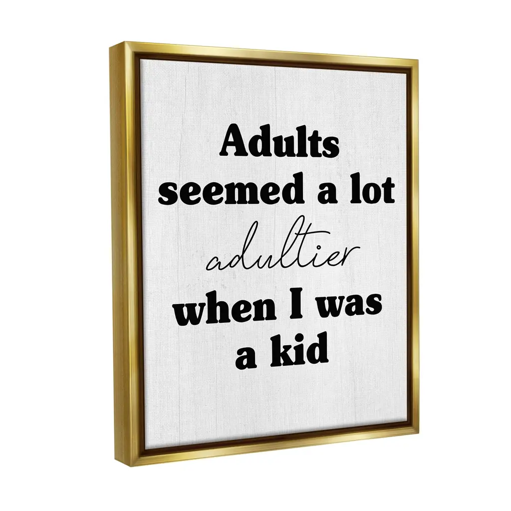 Elevate your home or office to the next level with Stupell Framed Floating Canvas Wall Art. Our premium hand-stretched canvas is mounted securely into a sturdy lightweight frame. The museum-style gap between the wrapped canvas and the box frame gives the illusion of floating artwork. Stupell Wall Art is made in the USA.Features: Dimensions: 17 x 1.7 x 21 Frame, 16 x 1.5 x 20 Canvas ArtFloating Frame Canvas Products are available in sizes 17"x21" and 25"x31". All Floating Frame Canvas Products have a 1.7" Depth.Wall Art is Ready to Hang with Hardware Free Hanging. No Installation required. For Easy Set Up Lean or Layer Artwork on Shelf or Against Wall. Artwork is Permently Fixed into the Frame.Our elevated 1.7" Thick Floating Frame is the perfect complement to our canvas style Wall Art. We use only the highest quality inks in house with industry leading printing solutions. Canvas is hand stretched over a durable wood foundation and then mounted securly into a Modern Box Frame. Made in the USA.Artwork Relates To: Phrase, Humor, Funny, Rustic, Sassy, Adults Seemed a lot Adultier When I was a KidDesign by Lil' Rue