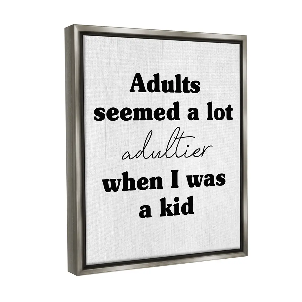 Elevate your home or office to the next level with Stupell Framed Floating Canvas Wall Art. Our premium hand-stretched canvas is mounted securely into a sturdy lightweight frame. The museum-style gap between the wrapped canvas and the box frame gives the illusion of floating artwork. Stupell Wall Art is made in the USA.Features: Dimensions: 17 x 1.7 x 21 Frame, 16 x 1.5 x 20 Canvas ArtFloating Frame Canvas Products are available in sizes 17"x21" and 25"x31". All Floating Frame Canvas Products have a 1.7" Depth.Wall Art is Ready to Hang with Hardware Free Hanging. No Installation required. For Easy Set Up Lean or Layer Artwork on Shelf or Against Wall. Artwork is Permently Fixed into the Frame.Our elevated 1.7" Thick Floating Frame is the perfect complement to our canvas style Wall Art. We use only the highest quality inks in house with industry leading printing solutions. Canvas is hand stretched over a durable wood foundation and then mounted securly into a Modern Box Frame. Made in the USA.Artwork Relates To: Phrase, Humor, Funny, Rustic, Sassy, Adults Seemed a lot Adultier When I was a KidDesign by Lil' Rue