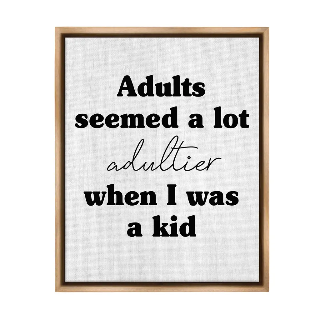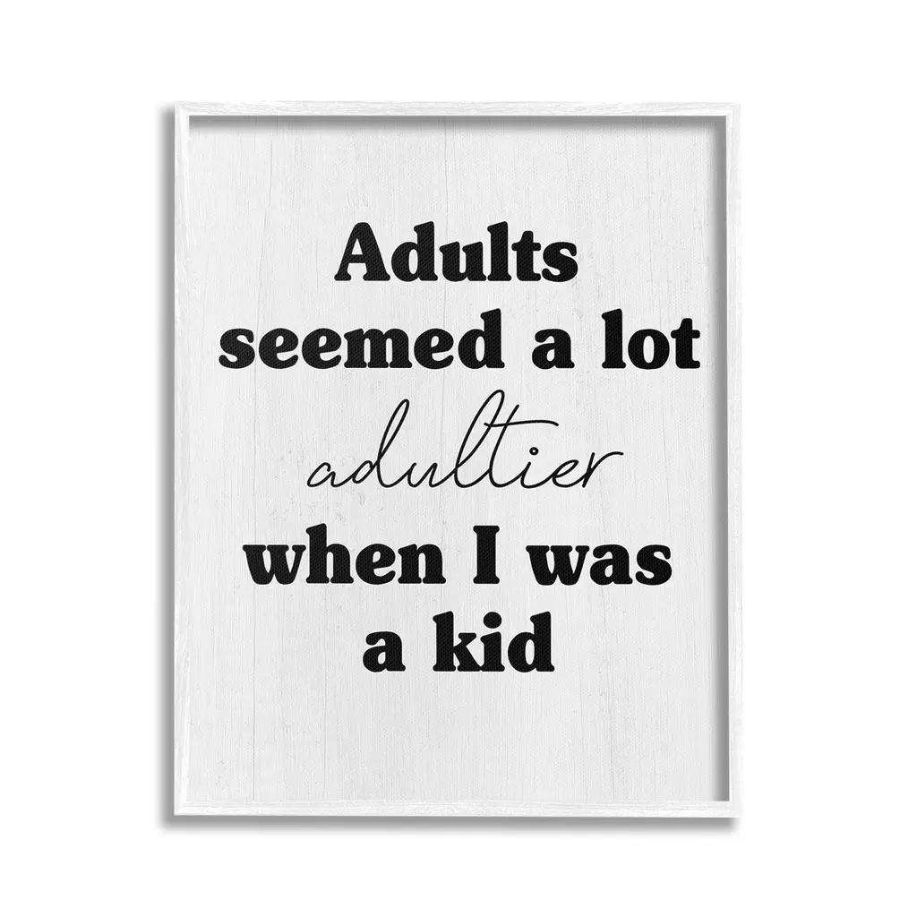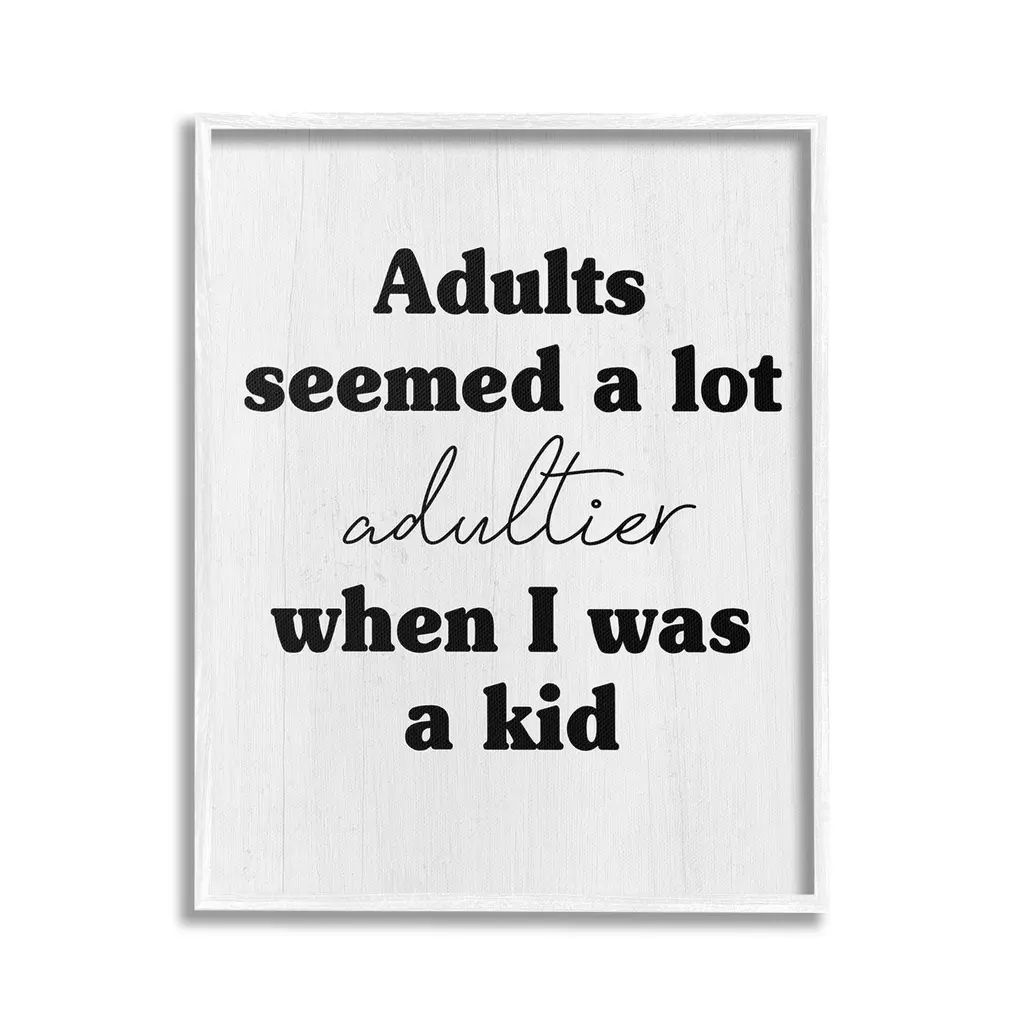 Our wall plaques start as high-quality lithograph prints mounted on durable 0.5-inch thick MDF wood. Each piece is hand finished and comes with a fresh layer of white foil on the sides to give it a crisp, clean look. Plaques arrive ready to hang without installation and come with removable plastic corners to keep them from damage in transit. Stupell Wall Art is made in the USA.Features: Dimensions: 10 x 0.5 x 15 InchesWall Plaque Product Sizes Include 10"x15" and 13"x19". All wall plaque products have a 0.5" Depth. Wall Art is Ready to Hang with Hardware Free Hanging. No installation required. For Easy Set Up Lean or Layer Artwork on Shelf or Against Wall.All of our wall plaques start off as high quality lithograph prints that are then mounted on durable 0.5 inch thick MDF wood. Each piece is hand finished and comes with a fresh layer of foil on the sides to give it a crisp clean look. Made In USA.Artwork Relates To: Phrase, Humor, Funny, Rustic, Sassy, Adults Seemed a lot Adultier When I was a KidDesign by Lil' Rue