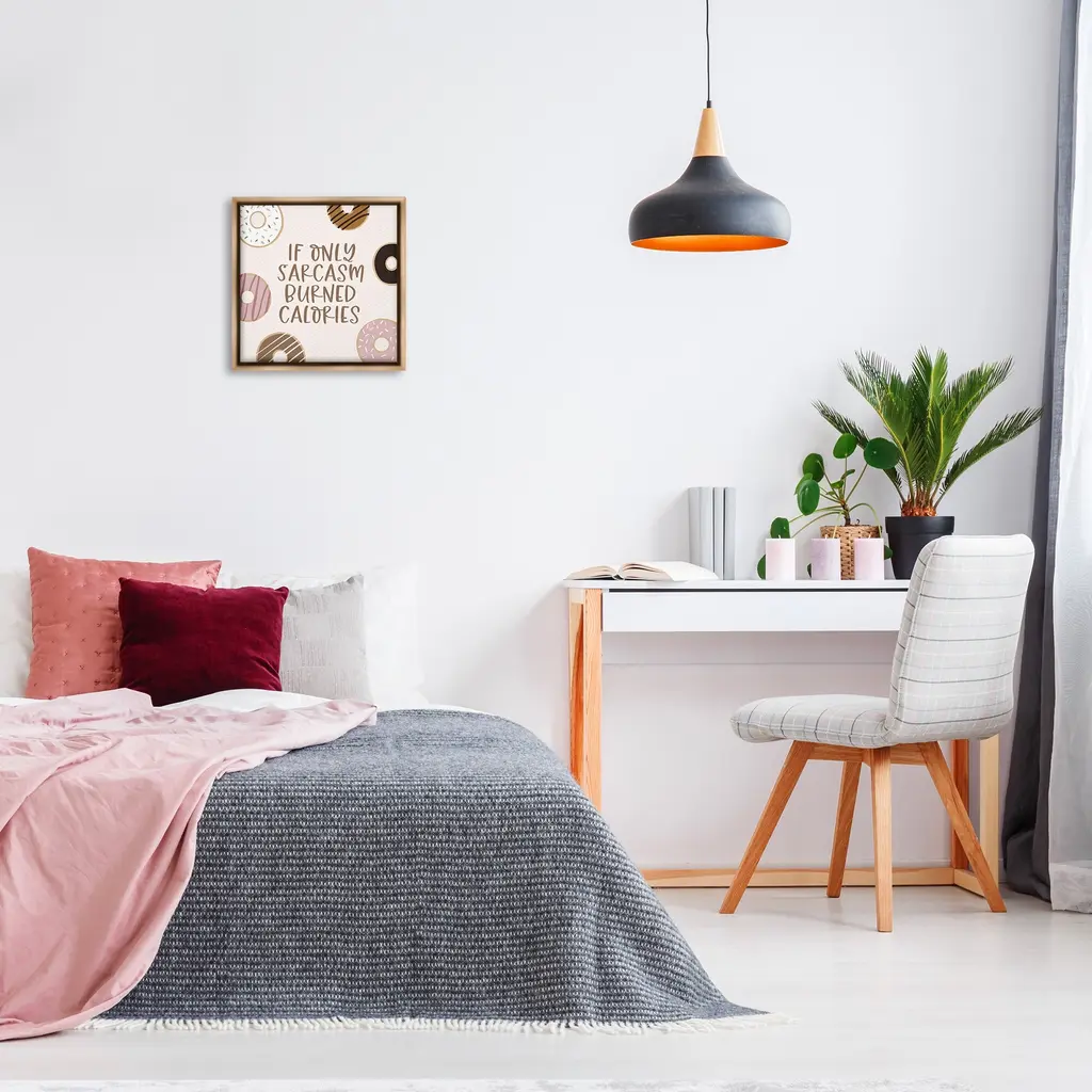 Elevate your home or office to the next level with Stupell Framed Floating Canvas Wall Art. Our premium hand-stretched canvas is mounted securely into a sturdy lightweight frame. The museum-style gap between the wrapped canvas and the box frame gives the illusion of floating artwork. Stupell Wall Art is made in the USA.Features: Dimensions: 18 x 1.7 x 18 Frame, 17 x 1.5 x 17 Canvas ArtFloating Frame Canvas Products are available in sizes 18"x18" and 25"x25". All Floating Frame Canvas Products have a 1.7" Depth.Wall Art is Ready to Hang with Hardware Free Hanging. No Installation required. For Easy Set Up Lean or Layer Artwork on Shelf or Against Wall. Artwork is Permently Fixed into the Frame.Our elevated 1.7" Thick Floating Frame is the perfect complement to our canvas style Wall Art. We use only the highest quality inks in house with industry leading printing solutions. Canvas is hand stretched over a durable wood foundation and then mounted securly into a Modern Box Frame. Made in the USA.Artwork Relates To: Food, Sweets, Donut, Kitchen, Dessert, Humor, Sassy, Pattern, Funny, If Only Sarcasm Burned CaloriesDesign by Lady Louise Designs