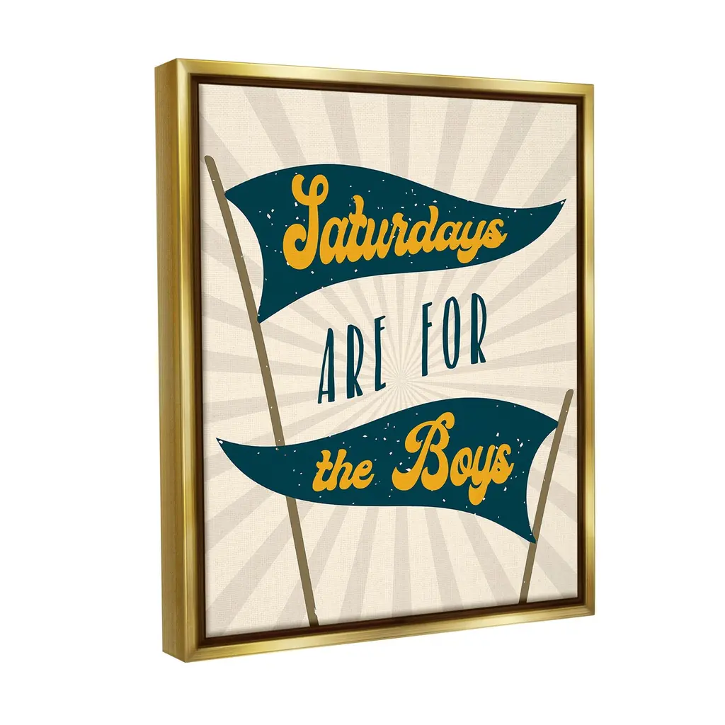 Elevate your home or office to the next level with Stupell Framed Floating Canvas Wall Art. Our premium hand-stretched canvas is mounted securely into a sturdy lightweight frame. The museum-style gap between the wrapped canvas and the box frame gives the illusion of floating artwork. Stupell Wall Art is made in the USA.Features: Dimensions: 17 x 1.7 x 21 Frame, 16 x 1.5 x 20 Canvas ArtFloating Frame Canvas Products are available in sizes 17"x21" and 25"x31". All Floating Frame Canvas Products have a 1.7" Depth.Wall Art is Ready to Hang with Hardware Free Hanging. No Installation required. For Easy Set Up Lean or Layer Artwork on Shelf or Against Wall. Artwork is Permently Fixed into the Frame.Our elevated 1.7" Thick Floating Frame is the perfect complement to our canvas style Wall Art. We use only the highest quality inks in house with industry leading printing solutions. Canvas is hand stretched over a durable wood foundation and then mounted securly into a Modern Box Frame. Made in the USA.Artwork Relates To: Flag, Banner, Pattern, Stripes, Rays, Saturdays are for the BoysDesign by Lil' Rue