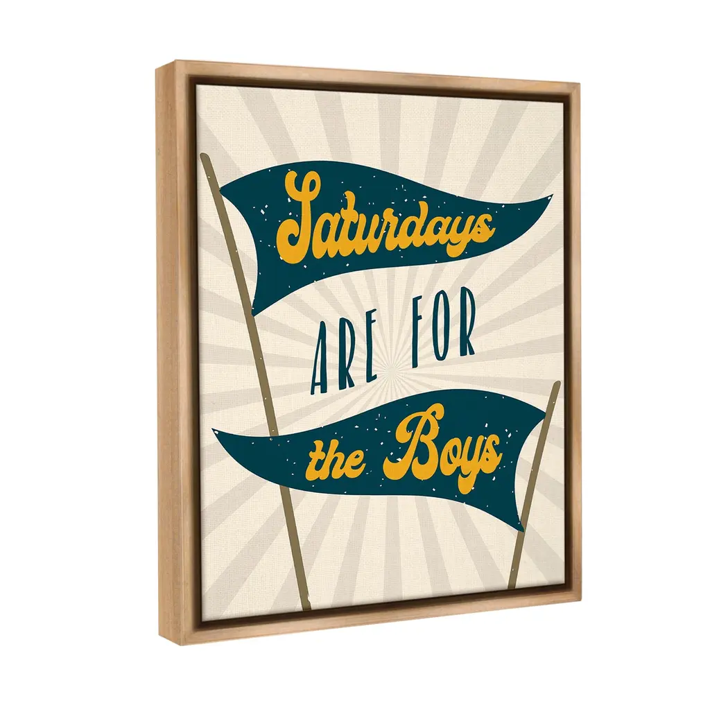 Elevate your home or office to the next level with Stupell Framed Floating Canvas Wall Art. Our premium hand-stretched canvas is mounted securely into a sturdy lightweight frame. The museum-style gap between the wrapped canvas and the box frame gives the illusion of floating artwork. Stupell Wall Art is made in the USA.Features: Dimensions: 17 x 1.7 x 21 Frame, 16 x 1.5 x 20 Canvas ArtFloating Frame Canvas Products are available in sizes 17"x21" and 25"x31". All Floating Frame Canvas Products have a 1.7" Depth.Wall Art is Ready to Hang with Hardware Free Hanging. No Installation required. For Easy Set Up Lean or Layer Artwork on Shelf or Against Wall. Artwork is Permently Fixed into the Frame.Our elevated 1.7" Thick Floating Frame is the perfect complement to our canvas style Wall Art. We use only the highest quality inks in house with industry leading printing solutions. Canvas is hand stretched over a durable wood foundation and then mounted securly into a Modern Box Frame. Made in the USA.Artwork Relates To: Flag, Banner, Pattern, Stripes, Rays, Saturdays are for the BoysDesign by Lil' Rue