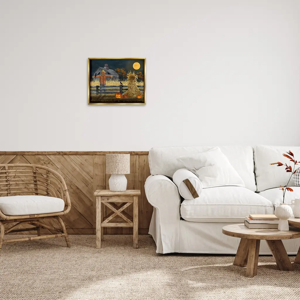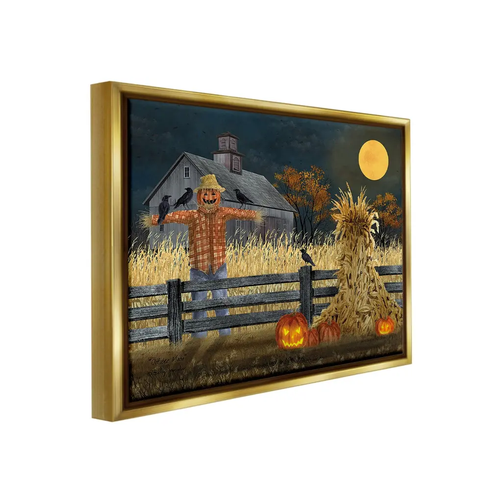 Elevate your home or office to the next level with Stupell Framed Floating Canvas Wall Art. Our premium hand-stretched canvas is mounted securely into a sturdy lightweight frame. The museum-style gap between the wrapped canvas and the box frame gives the illusion of floating artwork. Stupell Wall Art is made in the USA.Features: Dimensions: 21 x 1.7 x 17 Frame, 20 x 1.5 x 16 Canvas ArtFloating Frame Canvas Products are available in sizes 21"x17" and 31"x25". All Floating Frame Canvas Products have a 1.7" Depth.Wall Art is Ready to Hang with Hardware Free Hanging. No Installation required. For Easy Set Up Lean or Layer Artwork on Shelf or Against Wall. Artwork is Permently Fixed into the Frame.Our elevated 1.7" Thick Floating Frame is the perfect complement to our canvas style Wall Art. We use only the highest quality inks in house with industry leading printing solutions. Canvas is hand stretched over a durable wood foundation and then mounted securly into a Modern Box Frame. Made in the USA.Artwork Relates To: Festival, Halloween, Jack-o-Lantern, Fall, Autumn, Farm, Landscape, Pumpkin, Moon, Crow, Scarecrow, CountryDesign by Billy Jacobs