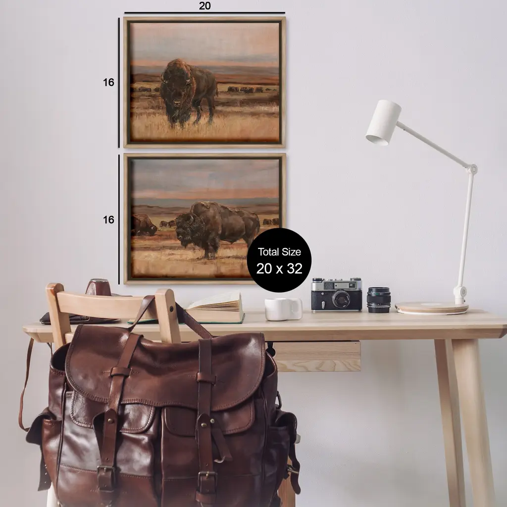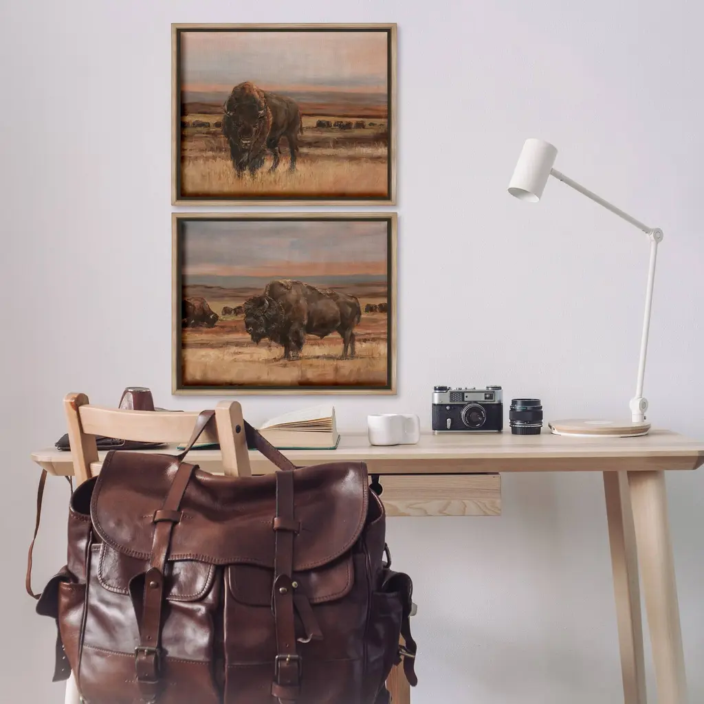 Elevate your home or office to the next level with Stupell Framed Floating Canvas Wall Art. Our premium hand-stretched canvas is mounted securely into a sturdy lightweight frame. The museum-style gap between the wrapped canvas and the box frame gives the illusion of floating artwork. Stupell Wall Art is made in the USA.Features: Dimensions: 2 Piece Set, Each Frame is 17 x 1.7 x 21Two Piece Floater Framed Canvas are available as 21"x17" or 31"x24" Panels. All Floater Frame Products have a 1.7" Depth.Wall Art is Ready to Hang with Hardware Free Hanging. No Installation required. For Easy Set Up Lean or Layer Artwork on Shelf or Against Wall. Artwork is Permently Fixed into the Frame.Our elevated 1.7" Thick Floating Frame is the perfect complement to our canvas style Wall Art. We use only the highest quality inks in house with industry leading printing solutions. Canvas is hand stretched over a durable wood foundation and then mounted securly into a Modern Box Frame. Made in the USA.Artwork Relates To: Animal, Bison, Mammal, Wildlife, Buffalo, Bull, Field, Nature, Farm, CountryDesign by Ethan Harper