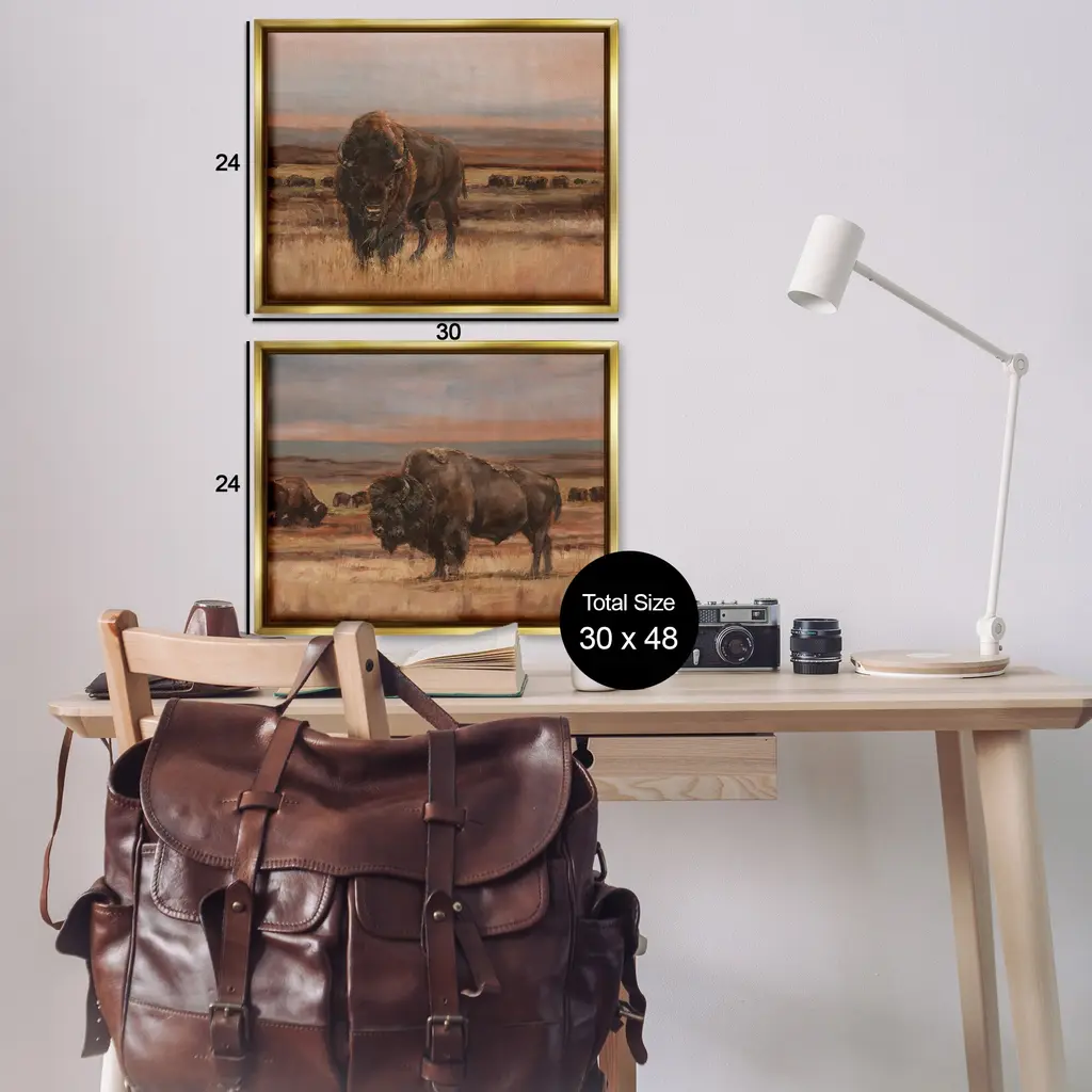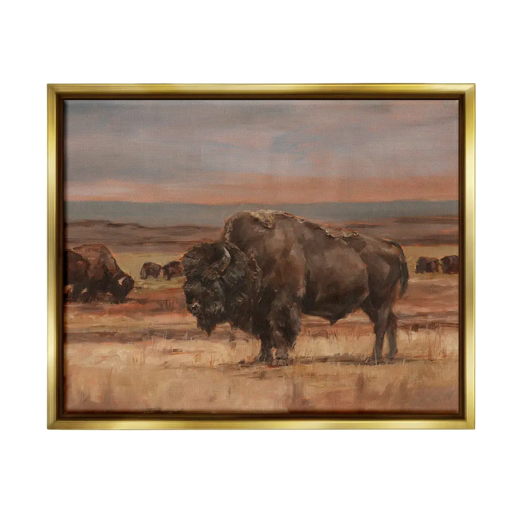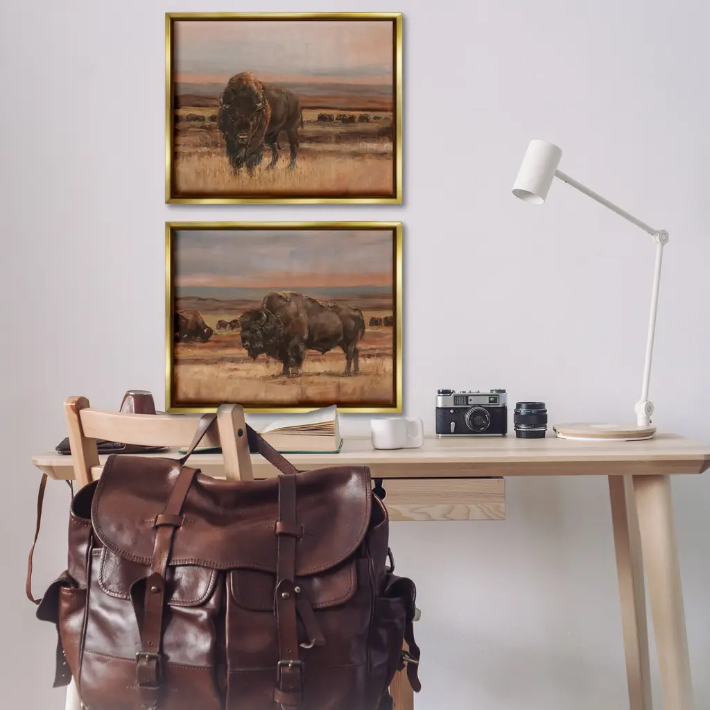 Elevate your home or office to the next level with Stupell Framed Floating Canvas Wall Art. Our premium hand-stretched canvas is mounted securely into a sturdy lightweight frame. The museum-style gap between the wrapped canvas and the box frame gives the illusion of floating artwork. Stupell Wall Art is made in the USA.Features: Dimensions: 2 Piece Set, Each Frame is 17 x 1.7 x 21Two Piece Floater Framed Canvas are available as 21"x17" or 31"x24" Panels. All Floater Frame Products have a 1.7" Depth.Wall Art is Ready to Hang with Hardware Free Hanging. No Installation required. For Easy Set Up Lean or Layer Artwork on Shelf or Against Wall. Artwork is Permently Fixed into the Frame.Our elevated 1.7" Thick Floating Frame is the perfect complement to our canvas style Wall Art. We use only the highest quality inks in house with industry leading printing solutions. Canvas is hand stretched over a durable wood foundation and then mounted securly into a Modern Box Frame. Made in the USA.Artwork Relates To: Animal, Bison, Mammal, Wildlife, Buffalo, Bull, Field, Nature, Farm, CountryDesign by Ethan Harper