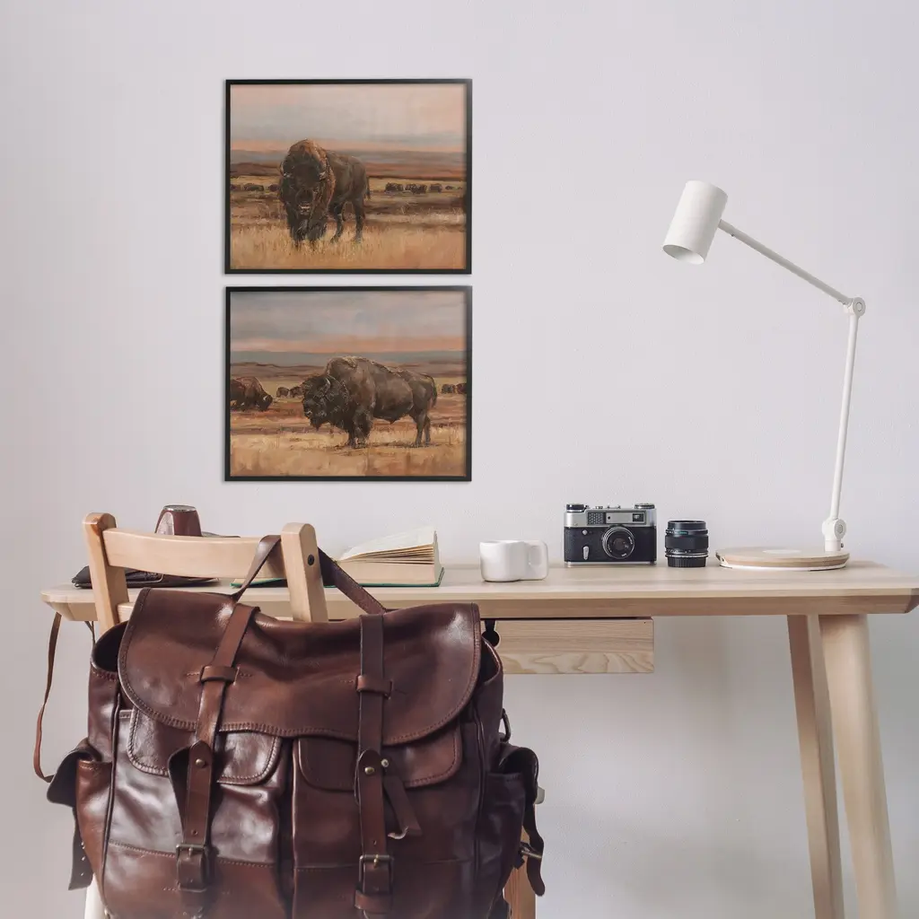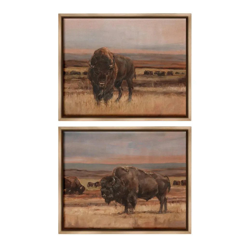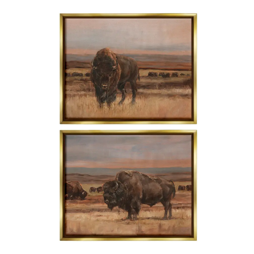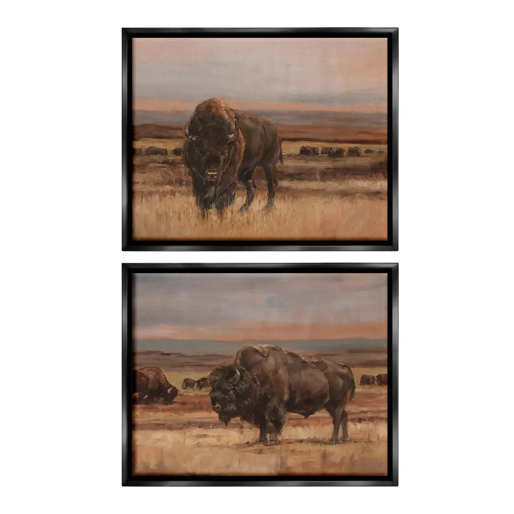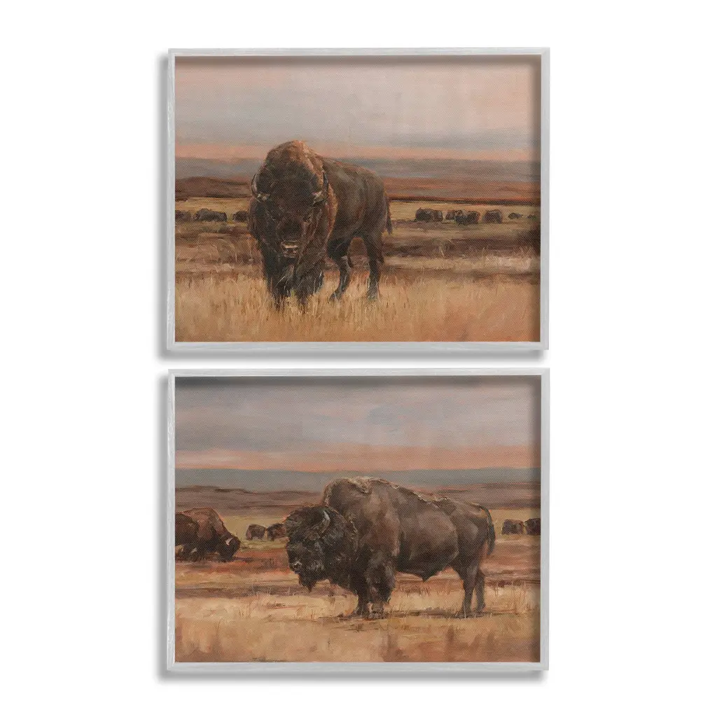 Fill any space in your home or office with our Framed Wall Art Sets. Our framed artwork is securely mounted into a 1.5-inch thick wood grain frame and ready to hang. Frames are available in three alluring styles: black, gray farmhouse and white. Stupell Wall Art is made in the USA.Features: Dimensions: 2 Piece Set, Each Panel is 14 x 1.5 x 11 FramedTwo Piece Framed Giclee Sets are available as 14"x11", 20"x16" or 30"x24" Panels. All Framed Giclee Products have a 1.5" Depth.Wall Art is Ready to Hang with Hardware Free Hanging. No installation required. For Easy Set Up Lean or Layer Artwork on Shelf or Against Wall.Curated Wall Art Sets make it easy for you complete the theme for any room. Our giclée prints are carefully mounted on a durable MDF backing, and then perfectly finished in a 1.5 inch thick woodgrain frame. Mounted frame colors include black, gray farmhouse and white. Made In USA.Artwork Relates To: Animal, Bison, Mammal, Wildlife, Buffalo, Bull, Field, Nature, Farm, CountryDesign by Ethan Harper