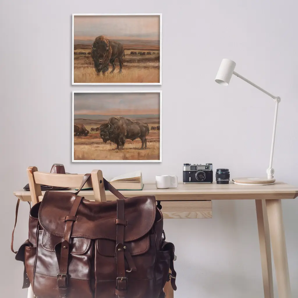 Fill any space in your home or office with our Framed Wall Art Sets. Our framed artwork is securely mounted into a 1.5-inch thick wood grain frame and ready to hang. Frames are available in three alluring styles: black, gray farmhouse and white. Stupell Wall Art is made in the USA.Features: Dimensions: 2 Piece Set, Each Panel is 14 x 1.5 x 11 FramedTwo Piece Framed Giclee Sets are available as 14"x11", 20"x16" or 30"x24" Panels. All Framed Giclee Products have a 1.5" Depth.Wall Art is Ready to Hang with Hardware Free Hanging. No installation required. For Easy Set Up Lean or Layer Artwork on Shelf or Against Wall.Curated Wall Art Sets make it easy for you complete the theme for any room. Our giclée prints are carefully mounted on a durable MDF backing, and then perfectly finished in a 1.5 inch thick woodgrain frame. Mounted frame colors include black, gray farmhouse and white. Made In USA.Artwork Relates To: Animal, Bison, Mammal, Wildlife, Buffalo, Bull, Field, Nature, Farm, CountryDesign by Ethan Harper