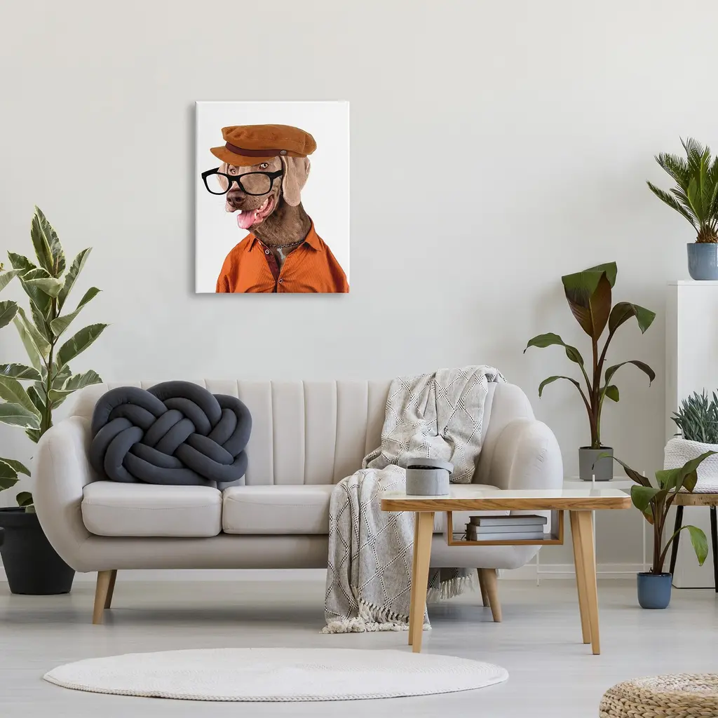 We create our stretched canvas to the highest standards. Using only the highest quality inks and canvas on Mimaki printers, we hand-cut and stretch each piece over a 1.5-inch thick wooden frame for hanging. As a result, the art comes ready to hang on the sturdy ledge with no installation required. Stupell Wall Art is made in the USA.Features: Dimensions: 16 x 1.5 x 20 InchesStretched Canvas Sizes Include Standard: 16 x 1.5 x 20 Large: 20 x 1.5 x 30 X-Large: 30 x 1.5 x 40 Oversized: 36 x 1.5 x 48Wall Art is Ready to Hang with Hardware Free Hanging. No installation required. For Easy Set Up Lean or Layer Artwork on Shelf or Against Wall.Our stretched canvas is created with the highest standards. We use only the highest quality inks and canvas on our in house Mimaki printers, and then hand cut and stretch each piece over a 1.5 inch thick wooden frame for hanging. Made In USA.Artwork Relates To: Hat, Glasses, Dog, Animal, PetDesign by Karen Smith