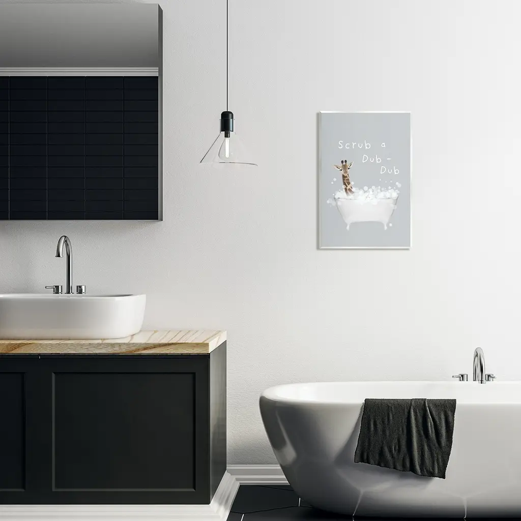 Our wall plaques start as high-quality lithograph prints mounted on durable 0.5-inch thick MDF wood. Each piece is hand finished and comes with a fresh layer of white foil on the sides to give it a crisp, clean look. Plaques arrive ready to hang without installation and come with removable plastic corners to keep them from damage in transit. Wall Art is made in the USA.Features: Dimensions: 10 x 0.5 x 15 InchesWall Plaque Sizes Include Standard: 10 x 0.5 x 15 Oversized: 13 x 0.5 x 19Wall Art is Ready to Hang with Hardware Free Hanging. No installation required. For Easy Set Up Lean or Layer Artwork on Shelf or Against Wall.All of our wall plaques start off as high quality lithograph prints that are then mounted on durable 0.5 inch thick MDF wood. Each piece is hand finished and comes with a fresh layer of foil on the sides to give it a crisp clean look. Made In USA.Artwork Relates To: Animal, Mammal, Wildlife, Tub, Bathtub, Bathroom, Scrub a Dub - Dub, GiraffeDesign by Leah Straatsma
