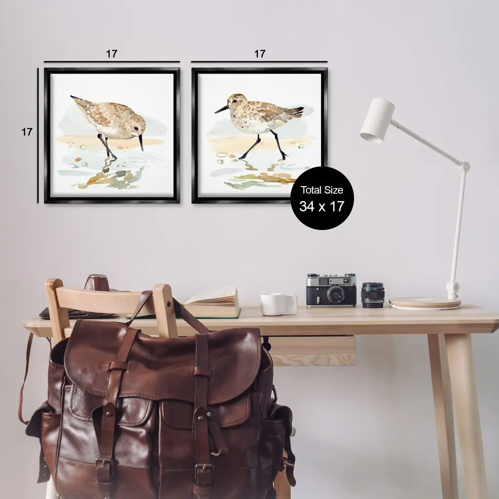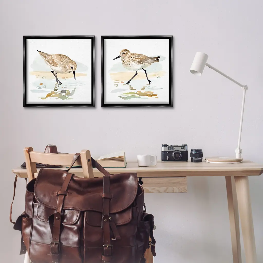 Elevate your home or office to the next level with Stupell Framed Floating Canvas Wall Art. Our premium hand-stretched canvas is mounted securely into a sturdy lightweight frame. The museum-style gap between the wrapped canvas and the box frame gives the illusion of floating artwork. Stupell Wall Art is made in the USA.Features: Dimensions: 2 Piece Set, Each Frame is 18 x 1.7 x 18Two Piece Floating Frame Canvas Products are available as 18"x18" or 25"x25" Panels. All Floating Frame Canvas Products have a 1.7" Depth.Wall Art is Ready to Hang with Hardware Free Hanging. No Installation required. For Easy Set Up Lean or Layer Artwork on Shelf or Against Wall. Artwork is Permently Fixed into the Frame.Our elevated 1.7" Thick Floating Frame is the perfect complement to our canvas style Wall Art. We use only the highest quality inks in house with industry leading printing solutions. Canvas is hand stretched over a durable wood foundation and then mounted securly into a Modern Box Frame. Made in the USA.Artwork Relates To: Animal, Bird, Waterfowl, Beach, Seashell, Sea Life, Starfish, Shore, Coastal, SandpiperDesign by Victoria Barnes