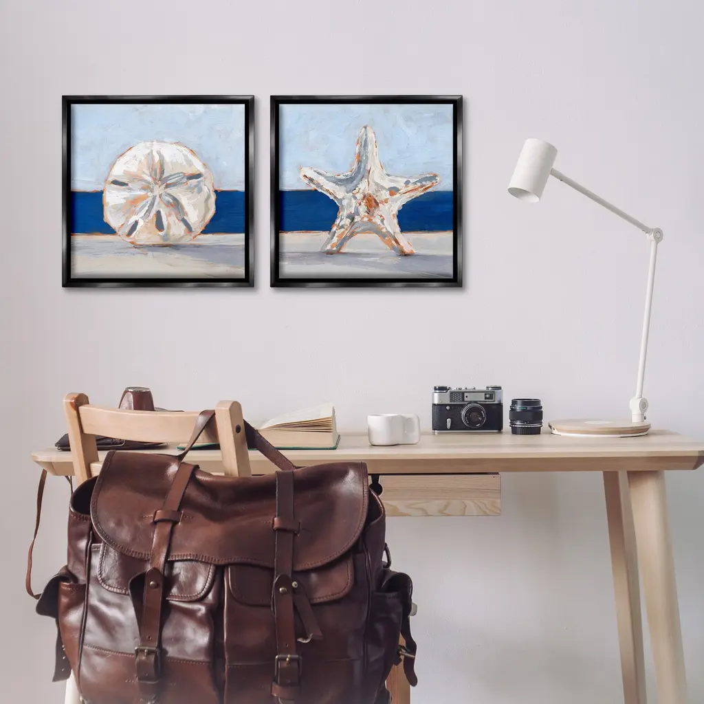 Elevate your home or office to the next level with Stupell Framed Floating Canvas Wall Art. Our premium hand-stretched canvas is mounted securely into a sturdy lightweight frame. The museum-style gap between the wrapped canvas and the box frame gives the illusion of floating artwork. Stupell Wall Art is made in the USA.Features: Dimensions: 2 Piece Set, Each Frame is 18 x 1.7 x 18Two Piece Floating Frame Canvas Products are available as 18"x18" or 25"x25" Panels. All Floating Frame Canvas Products have a 1.7" Depth.Wall Art is Ready to Hang with Hardware Free Hanging. No Installation required. For Easy Set Up Lean or Layer Artwork on Shelf or Against Wall. Artwork is Permently Fixed into the Frame.Our elevated 1.7" Thick Floating Frame is the perfect complement to our canvas style Wall Art. We use only the highest quality inks in house with industry leading printing solutions. Canvas is hand stretched over a durable wood foundation and then mounted securly into a Modern Box Frame. Made in the USA.Artwork Relates To: Beach, Nautical, Sea Life, Painting, Invertebrate, Starfish, BlueDesign by Ethan Harper