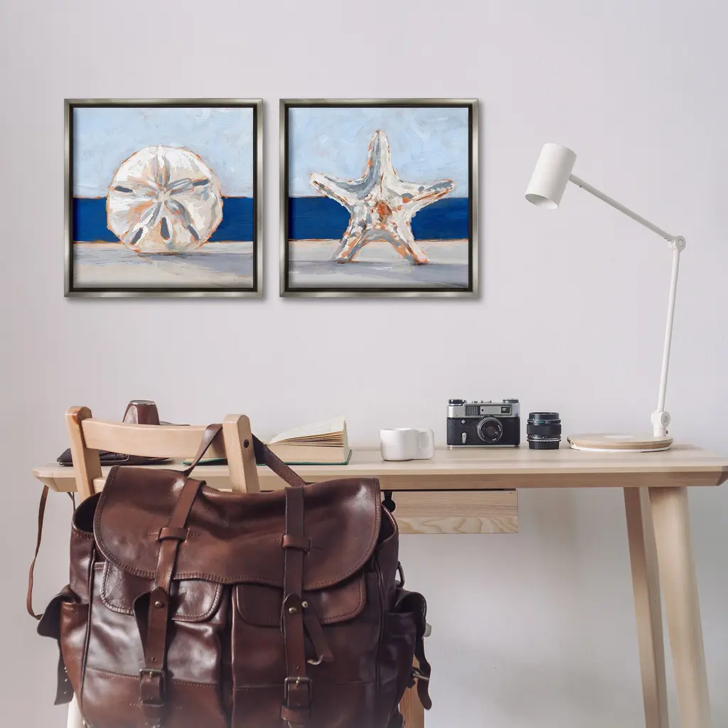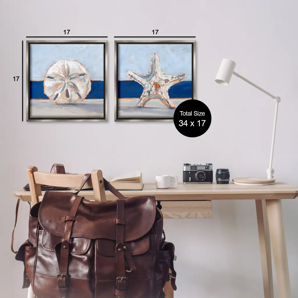 Elevate your home or office to the next level with Stupell Framed Floating Canvas Wall Art. Our premium hand-stretched canvas is mounted securely into a sturdy lightweight frame. The museum-style gap between the wrapped canvas and the box frame gives the illusion of floating artwork. Stupell Wall Art is made in the USA.Features: Dimensions: 2 Piece Set, Each Frame is 18 x 1.7 x 18Two Piece Floating Frame Canvas Products are available as 18"x18" or 25"x25" Panels. All Floating Frame Canvas Products have a 1.7" Depth.Wall Art is Ready to Hang with Hardware Free Hanging. No Installation required. For Easy Set Up Lean or Layer Artwork on Shelf or Against Wall. Artwork is Permently Fixed into the Frame.Our elevated 1.7" Thick Floating Frame is the perfect complement to our canvas style Wall Art. We use only the highest quality inks in house with industry leading printing solutions. Canvas is hand stretched over a durable wood foundation and then mounted securly into a Modern Box Frame. Made in the USA.Artwork Relates To: Beach, Nautical, Sea Life, Painting, Invertebrate, Starfish, BlueDesign by Ethan Harper