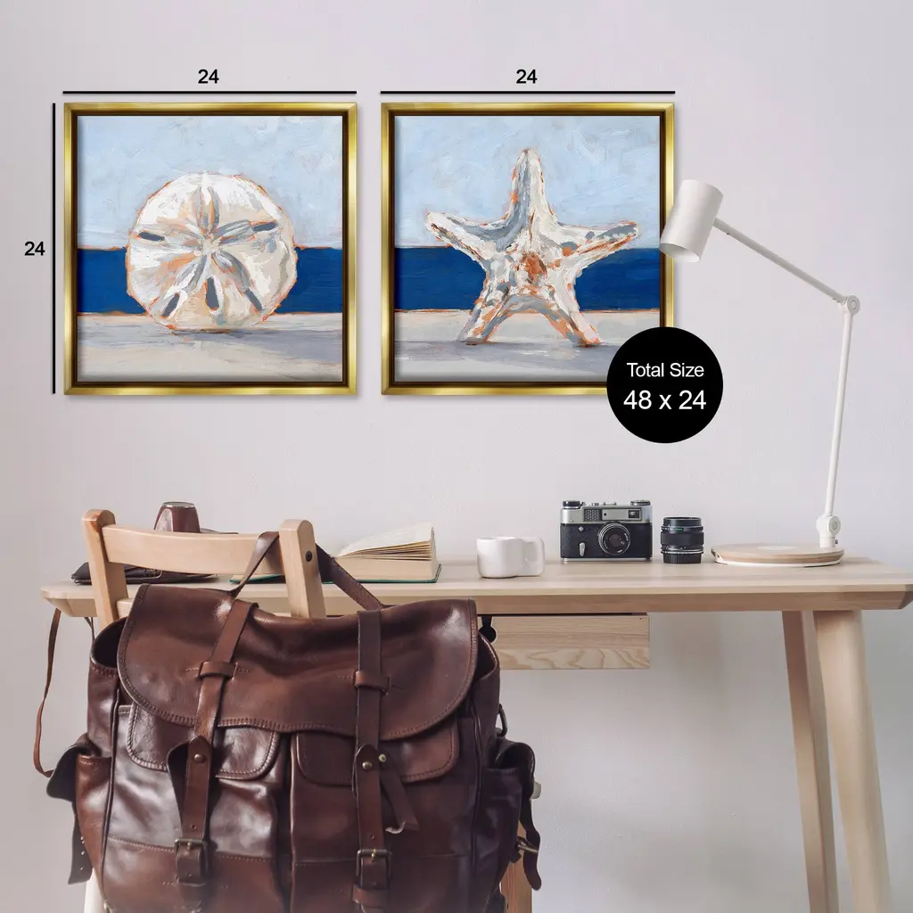 Elevate your home or office to the next level with Stupell Framed Floating Canvas Wall Art. Our premium hand-stretched canvas is mounted securely into a sturdy lightweight frame. The museum-style gap between the wrapped canvas and the box frame gives the illusion of floating artwork. Stupell Wall Art is made in the USA.Features: Dimensions: 2 Piece Set, Each Frame is 18 x 1.7 x 18Two Piece Floating Frame Canvas Products are available as 18"x18" or 25"x25" Panels. All Floating Frame Canvas Products have a 1.7" Depth.Wall Art is Ready to Hang with Hardware Free Hanging. No Installation required. For Easy Set Up Lean or Layer Artwork on Shelf or Against Wall. Artwork is Permently Fixed into the Frame.Our elevated 1.7" Thick Floating Frame is the perfect complement to our canvas style Wall Art. We use only the highest quality inks in house with industry leading printing solutions. Canvas is hand stretched over a durable wood foundation and then mounted securly into a Modern Box Frame. Made in the USA.Artwork Relates To: Beach, Nautical, Sea Life, Painting, Invertebrate, Starfish, BlueDesign by Ethan Harper