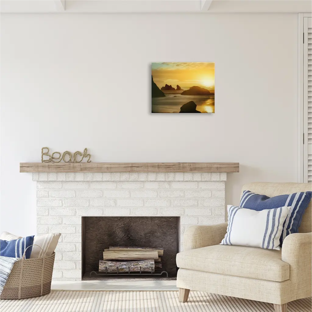 We create our stretched canvas to the highest standards. Using only the highest quality inks and canvas on Mimaki printers, we hand-cut and stretch each piece over a 1.5-inch thick wooden frame for hanging. As a result, the art comes ready to hang on the sturdy ledge with no installation required. Stupell Wall Art is made in the USA.Features: Dimensions: 20 x 1.5 x 16 InchesStretched Canvas Sizes Include Standard: 20 x 1.5 x 16 Large: 30 x 1.5 x 20 X-Large: 40 x 1.5 x 30 Oversized: 48 x 1.5 x 36Wall Art is Ready to Hang with Hardware Free Hanging. No installation required. For Easy Set Up Lean or Layer Artwork on Shelf or Against Wall.Our stretched canvas is created with the highest standards. We use only the highest quality inks and canvas on our in house Mimaki printers, and then hand cut and stretch each piece over a 1.5 inch thick wooden frame for hanging. Made In USA.Artwork Relates To: Nature, Outdoors, Sea, Water, Scenery, Cliff, Sunset, SunriseDesign by Dennis Frates