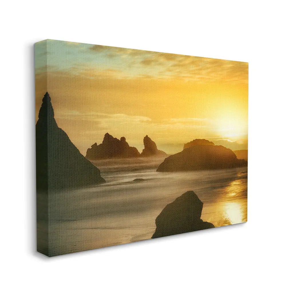 We create our stretched canvas to the highest standards. Using only the highest quality inks and canvas on Mimaki printers, we hand-cut and stretch each piece over a 1.5-inch thick wooden frame for hanging. As a result, the art comes ready to hang on the sturdy ledge with no installation required. Stupell Wall Art is made in the USA.Features: Dimensions: 20 x 1.5 x 16 InchesStretched Canvas Sizes Include Standard: 20 x 1.5 x 16 Large: 30 x 1.5 x 20 X-Large: 40 x 1.5 x 30 Oversized: 48 x 1.5 x 36Wall Art is Ready to Hang with Hardware Free Hanging. No installation required. For Easy Set Up Lean or Layer Artwork on Shelf or Against Wall.Our stretched canvas is created with the highest standards. We use only the highest quality inks and canvas on our in house Mimaki printers, and then hand cut and stretch each piece over a 1.5 inch thick wooden frame for hanging. Made In USA.Artwork Relates To: Nature, Outdoors, Sea, Water, Scenery, Cliff, Sunset, SunriseDesign by Dennis Frates
