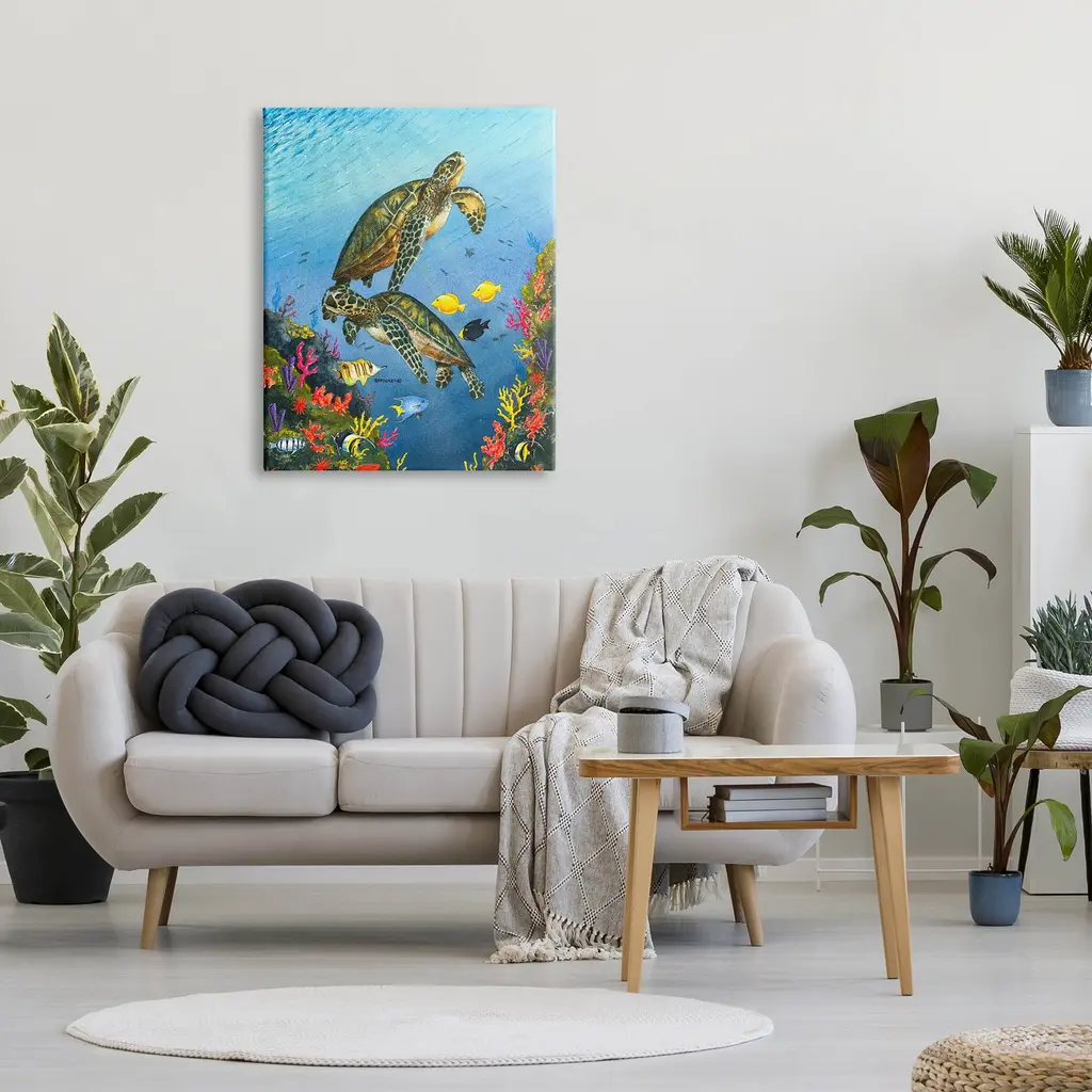 Proudly made in the USA, Our stretched canvas is created with the highest standards. We use only the highest quality inks and canvas on our in house Mimaki printers, and then hand cut and stretch each piece over a 1.5 inch thick wooden frame for hanging. The art comes ready to hang with no installation required.Features: Dimensions: 16 x 1.5 x 20 InchesStretched Canvas Sizes Include Standard: 16 x 1.5 x 20 Large: 20 x 1.5 x 30 X-Large: 30 x 1.5 x 40 Oversized: 36 x 1.5 x 48Wall Art is Ready to Hang - No Installation or Hardware Needed. For Easy Set Up Lean or Layer Artwork on Shelf or Against Wall.Our stretched canvas is created with the highest standards. We use only the highest quality inks and canvas on our in house Mimaki printers, and then hand cut and stretch each piece over a 1.5 inch thick wooden frame for hanging. Made In USA.Artwork Relates To: Turtle, Sea Life, Animal, Reptile, Sea Turtle, Tortoise, Fish, Sea, Water, Nature, Coral Reef, AquaticDesign by Dave Bartholet