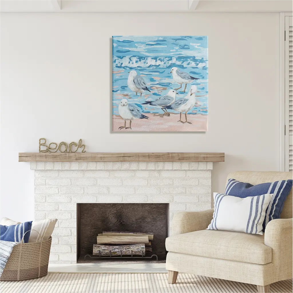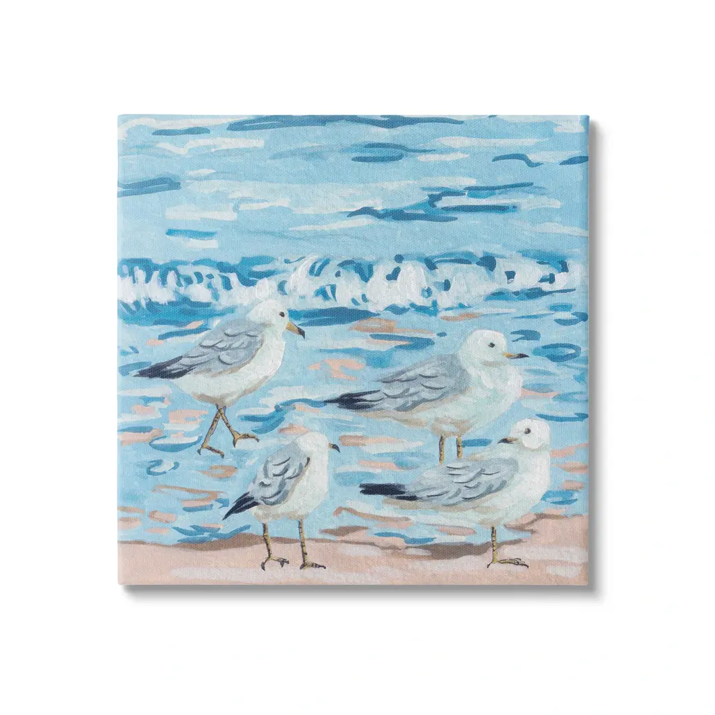 We create our stretched canvas to the highest standards. Using only the highest quality inks and canvas on Mimaki printers, we hand-cut and stretch each piece over a 1.5-inch thick wooden frame for hanging. As a result, the art comes ready to hang on the sturdy ledge with no installation required. Stupell Wall Art is made in the USA.Features: Dimensions: 17 x 1.5 x 17 InchesStretched Canvas Sizes Include Standard: 17 x 1.5 x 17 Large: 24 x 1.5 x 24 X-Large: 30 x 1.5 x 30 Oversized: 36 x 1.5 x 36Wall Art is Ready to Hang with Hardware Free Hanging. No installation required. For Easy Set Up Lean or Layer Artwork on Shelf or Against Wall.Our stretched canvas is created with the highest standards. We use only the highest quality inks and canvas on our in house Mimaki printers, and then hand cut and stretch each piece over a 1.5 inch thick wooden frame for hanging. Made In USA.Artwork Relates To: Animal, Bird, Waterfowl, Sandpipers, Beach, Shore, SeagullsDesign by Melissa Wang