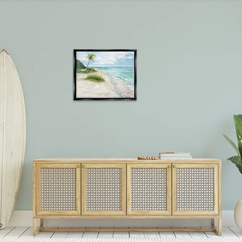 Elevate your home or office to the next level with Stupell Framed Floating Canvas Wall Art. Our premium hand-stretched canvas is mounted securely into a sturdy lightweight frame. The museum-style gap between the wrapped canvas and the box frame gives the illusion of floating artwork. Stupell Wall Art is made in the USA.Features: Dimensions: 21 x 1.7 x 17 Frame, 20 x 1.5 x 16 Canvas ArtFloating Frame Canvas Products are available in sizes 21"x17" and 31"x25". All Floating Frame Canvas Products have a 1.7" Depth.Wall Art is Ready to Hang with Hardware Free Hanging. No Installation required. For Easy Set Up Lean or Layer Artwork on Shelf or Against Wall. Artwork is Permently Fixed into the Frame.Our elevated 1.7" Thick Floating Frame is the perfect complement to our canvas style Wall Art. We use only the highest quality inks in house with industry leading printing solutions. Canvas is hand stretched over a durable wood foundation and then mounted securly into a Modern Box Frame. Made in the USA.Artwork Relates To: Summer, Nature, Scenery, Sea, Water, Shoreline, Path, Beach, Coast, Palm Tree, Tropical, Animal, SeagullDesign by Christine Reichow