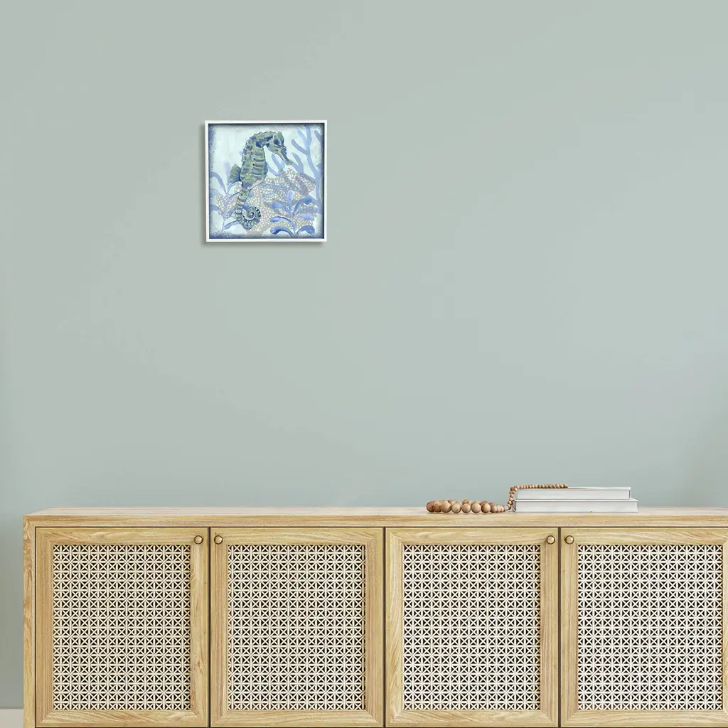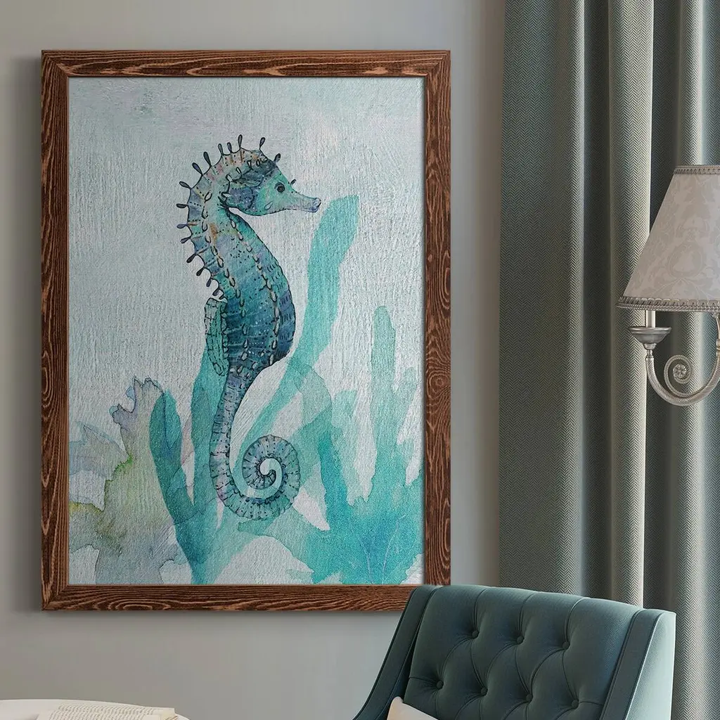 Our Framed Giclee Wall Art adds a touch of class to any space in your home or office. Frames are available in three alluring styles: black, gray farmhouse and white. Our textured artwork will add more depth and dimension to any space. Each piece is mounted with a 1.5 inch thick wood grain frame that is ready to hang! Looking for a statement piece? We have oversized artwork available.Features: Dimensions: 12 x 1.5 x 12 FramedFramed Giclee Sizes Include Standard: 12 x 1.5 x 12 Large: 17 x 1.5 x 17 Oversized: 24 x 1.5 x 24Wall Art is Ready to Hang - No Installation or Hardware Needed. For Easy Set Up Lean or Layer Artwork on Shelf or Against Wall.Our giclée prints are carefully mounted on a durable MDF backing, and then perfectly finished in a 1.5 inch thick woodgrain frame. Mounted frame colors include black, gray farmhouse and white. Made In USA.Artwork Relates To: Sea Life, Animal, Seahorse, Invertebrate, Underwater, Aquatic, CoralDesign by Erica Christopher