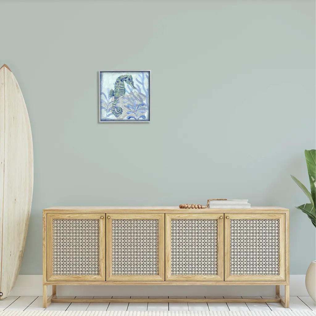 Our Framed Giclee Wall Art adds a touch of class to any space in your home or office. Frames are available in three alluring styles: black, gray farmhouse and white. Our textured artwork will add more depth and dimension to any space. Each piece is mounted with a 1.5 inch thick wood grain frame that is ready to hang! Looking for a statement piece? We have oversized artwork available.Features: Dimensions: 12 x 1.5 x 12 FramedFramed Giclee Sizes Include Standard: 12 x 1.5 x 12 Large: 17 x 1.5 x 17 Oversized: 24 x 1.5 x 24Wall Art is Ready to Hang - No Installation or Hardware Needed. For Easy Set Up Lean or Layer Artwork on Shelf or Against Wall.Our giclée prints are carefully mounted on a durable MDF backing, and then perfectly finished in a 1.5 inch thick woodgrain frame. Mounted frame colors include black, gray farmhouse and white. Made In USA.Artwork Relates To: Sea Life, Animal, Seahorse, Invertebrate, Underwater, Aquatic, CoralDesign by Erica Christopher