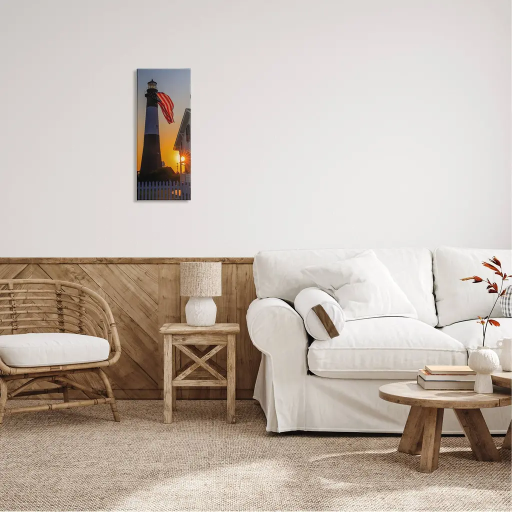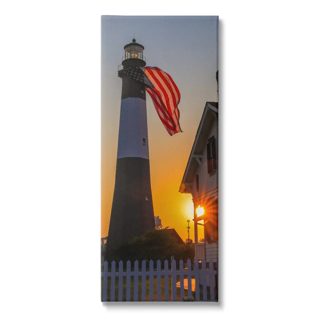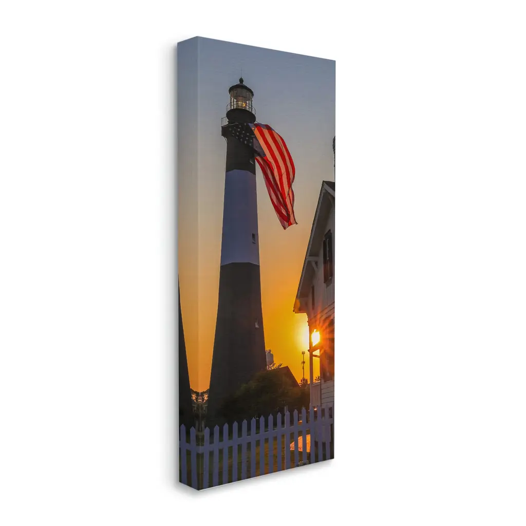 Stupell Seaside American Flag Lighthouse Beacon Sunset Rays Canvas Wall Art - Orange - 13 X 30