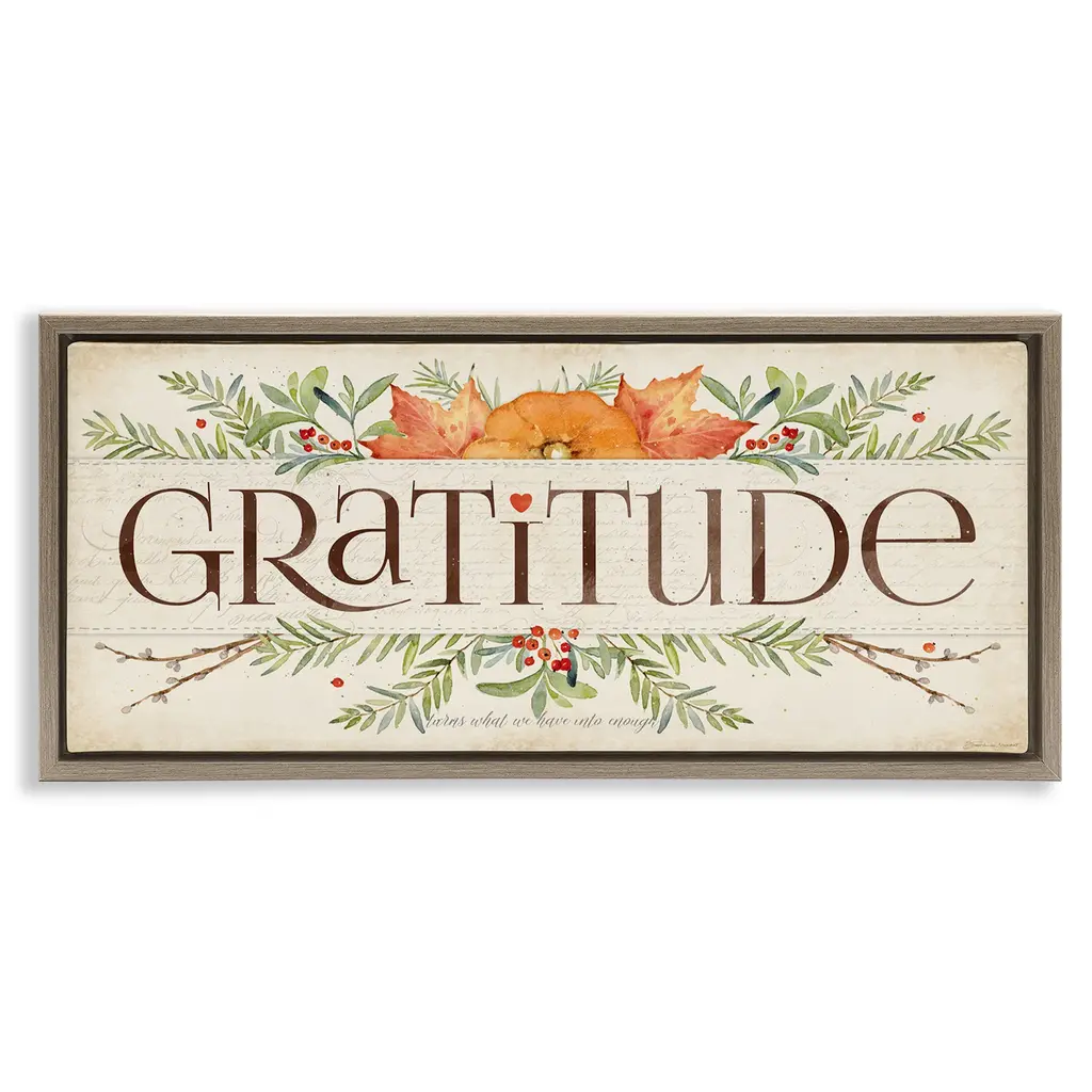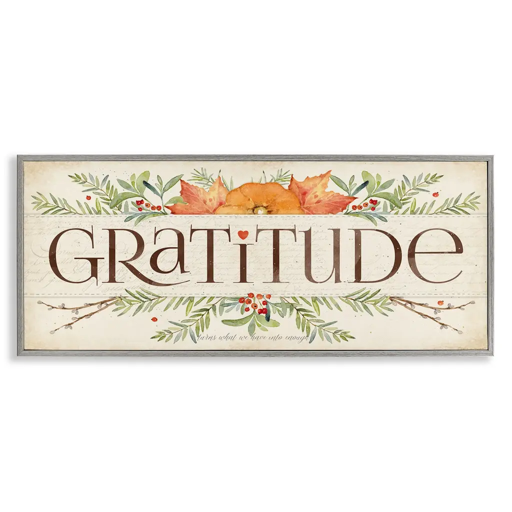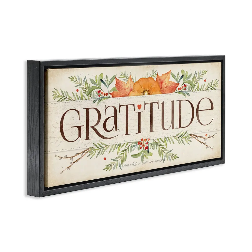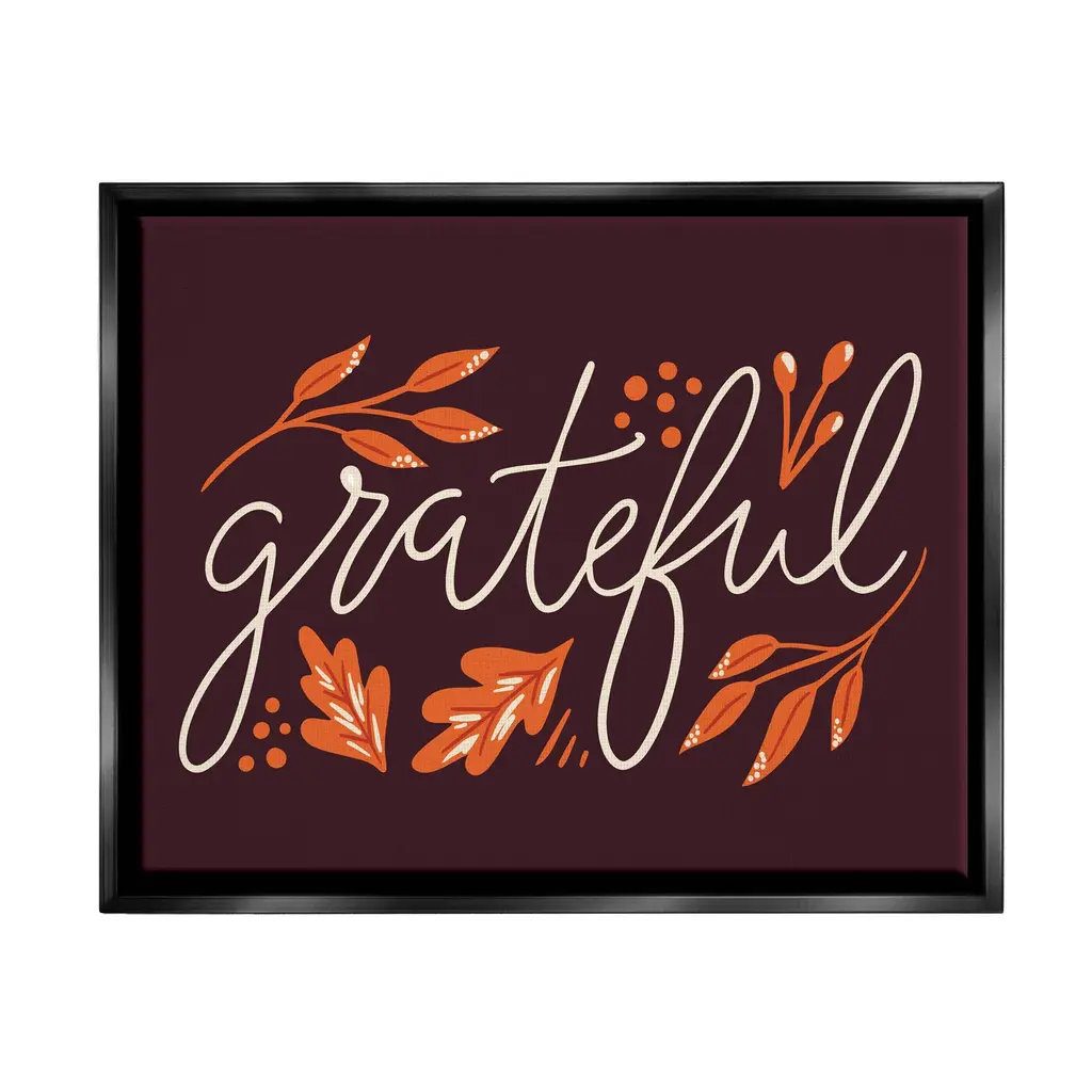 Elevate your home or office to the next level with Stupell Framed Floating Canvas Wall Art. Our premium hand-stretched canvas is mounted securely into a sturdy lightweight frame. The museum-style gap between the wrapped canvas and the box frame gives the illusion of floating artwork. Stupell Wall Art is made in the USA.Features: Dimensions: 25 x 1.7 x 11 Frame, 24 x 1.5 x 10 Canvas ArtFloating Frame Canvas Products are available in sizes 25"x11" and 31"x14". All Floating Frame Canvas Products have a 1.7" Depth.Wall Art is Ready to Hang with Hardware Free Hanging. No Installation required. For Easy Set Up Lean or Layer Artwork on Shelf or Against Wall. Artwork is Permently Fixed into the Frame.Our elevated 1.7" Thick Floating Frame is the perfect complement to our canvas style Wall Art. We use only the highest quality inks in house with industry leading printing solutions. Canvas is hand stretched over a durable wood foundation and then mounted securly into a Modern Box Frame. Made in the USA.Artwork Relates To: Seasonal, Fall, Autumn, Phrase, Country, GratitudeDesign by Stephanie Workman Marrott