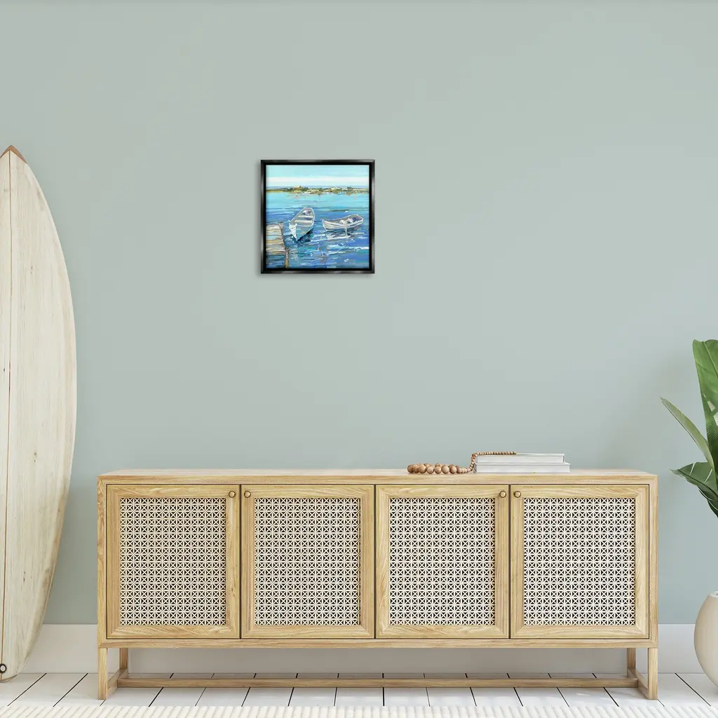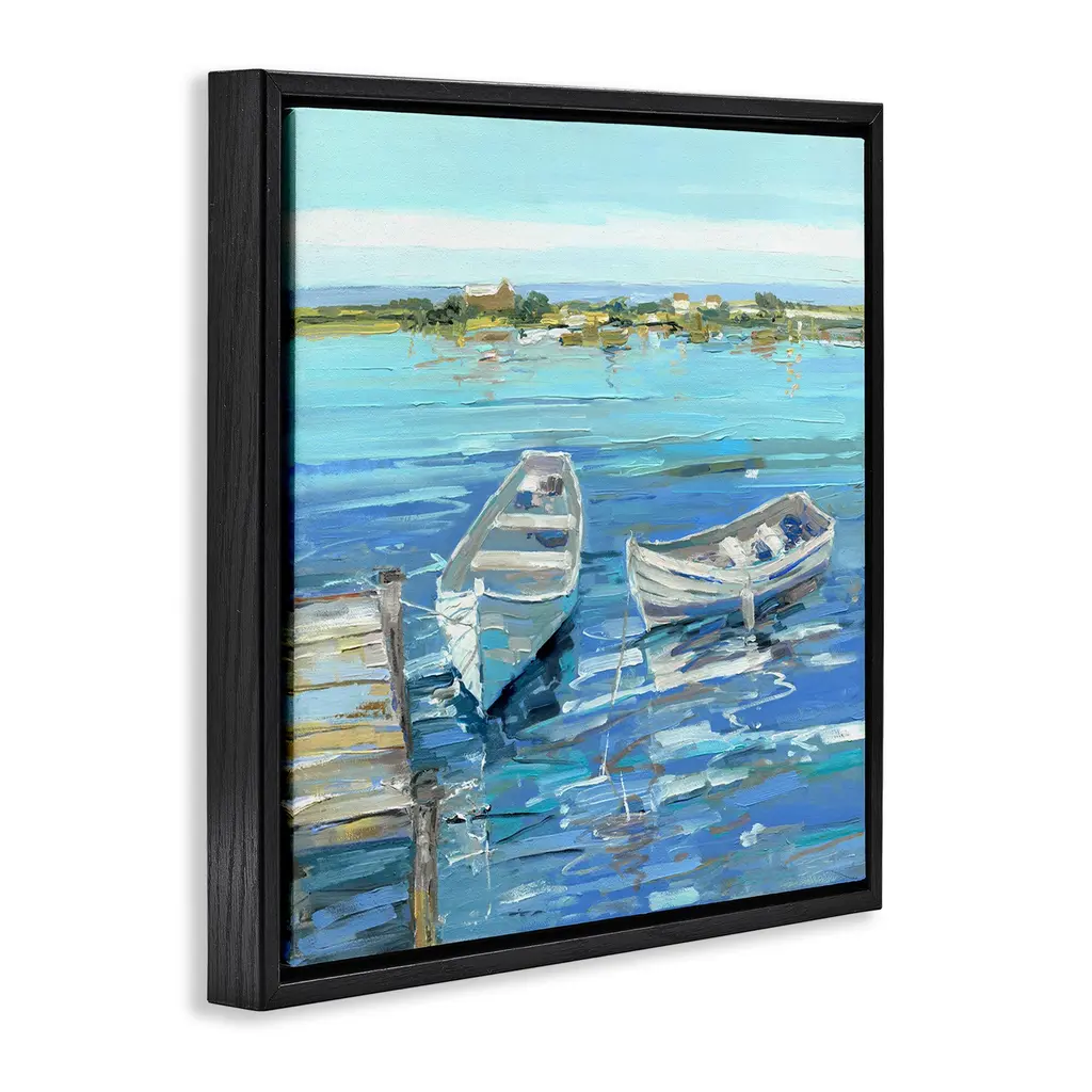 Elevate your home or office to the next level with Stupell Framed Floating Canvas Wall Art. Our premium hand-stretched canvas is mounted securely into a sturdy lightweight frame. The museum-style gap between the wrapped canvas and the box frame gives the illusion of floating artwork. Stupell Wall Art is made in the USA.Features: Dimensions: 18 x 1.7 x 18 Frame, 17 x 1.5 x 17 Canvas ArtFloating Frame Canvas Products are available in sizes 18"x18" and 25"x25". All Floating Frame Canvas Products have a 1.7" Depth.Wall Art is Ready to Hang with Hardware Free Hanging. No Installation required. For Easy Set Up Lean or Layer Artwork on Shelf or Against Wall. Artwork is Permently Fixed into the Frame.Our elevated 1.7" Thick Floating Frame is the perfect complement to our canvas style Wall Art. We use only the highest quality inks in house with industry leading printing solutions. Canvas is hand stretched over a durable wood foundation and then mounted securly into a Modern Box Frame. Made in the USA.Artwork Relates To: Waterfront, Water, Dinghy, Watercraft, Boat, Painting, Rowboat, Sea, DockDesign by Sally Swatland