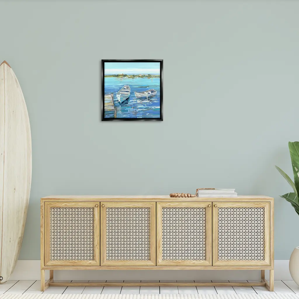 Elevate your home or office to the next level with Stupell Framed Floating Canvas Wall Art. Our premium hand-stretched canvas is mounted securely into a sturdy lightweight frame. The museum-style gap between the wrapped canvas and the box frame gives the illusion of floating artwork. Stupell Wall Art is made in the USA.Features: Dimensions: 18 x 1.7 x 18 Frame, 17 x 1.5 x 17 Canvas ArtFloating Frame Canvas Products are available in sizes 18"x18" and 25"x25". All Floating Frame Canvas Products have a 1.7" Depth.Wall Art is Ready to Hang with Hardware Free Hanging. No Installation required. For Easy Set Up Lean or Layer Artwork on Shelf or Against Wall. Artwork is Permently Fixed into the Frame.Our elevated 1.7" Thick Floating Frame is the perfect complement to our canvas style Wall Art. We use only the highest quality inks in house with industry leading printing solutions. Canvas is hand stretched over a durable wood foundation and then mounted securly into a Modern Box Frame. Made in the USA.Artwork Relates To: Waterfront, Water, Dinghy, Watercraft, Boat, Painting, Rowboat, Sea, DockDesign by Sally Swatland