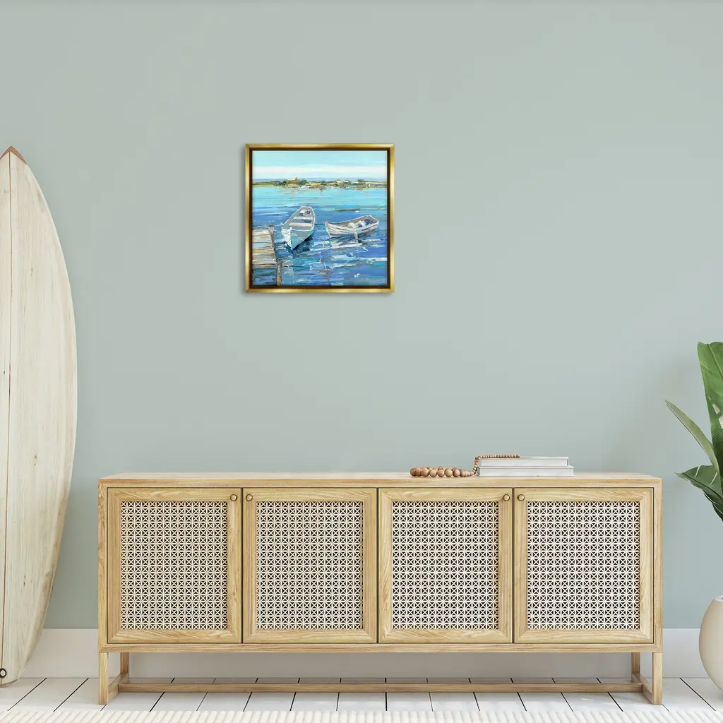 Elevate your home or office to the next level with Stupell Framed Floating Canvas Wall Art. Our premium hand-stretched canvas is mounted securely into a sturdy lightweight frame. The museum-style gap between the wrapped canvas and the box frame gives the illusion of floating artwork. Stupell Wall Art is made in the USA.Features: Dimensions: 18 x 1.7 x 18 Frame, 17 x 1.5 x 17 Canvas ArtFloating Frame Canvas Products are available in sizes 18"x18" and 25"x25". All Floating Frame Canvas Products have a 1.7" Depth.Wall Art is Ready to Hang with Hardware Free Hanging. No Installation required. For Easy Set Up Lean or Layer Artwork on Shelf or Against Wall. Artwork is Permently Fixed into the Frame.Our elevated 1.7" Thick Floating Frame is the perfect complement to our canvas style Wall Art. We use only the highest quality inks in house with industry leading printing solutions. Canvas is hand stretched over a durable wood foundation and then mounted securly into a Modern Box Frame. Made in the USA.Artwork Relates To: Waterfront, Water, Dinghy, Watercraft, Boat, Painting, Rowboat, Sea, DockDesign by Sally Swatland