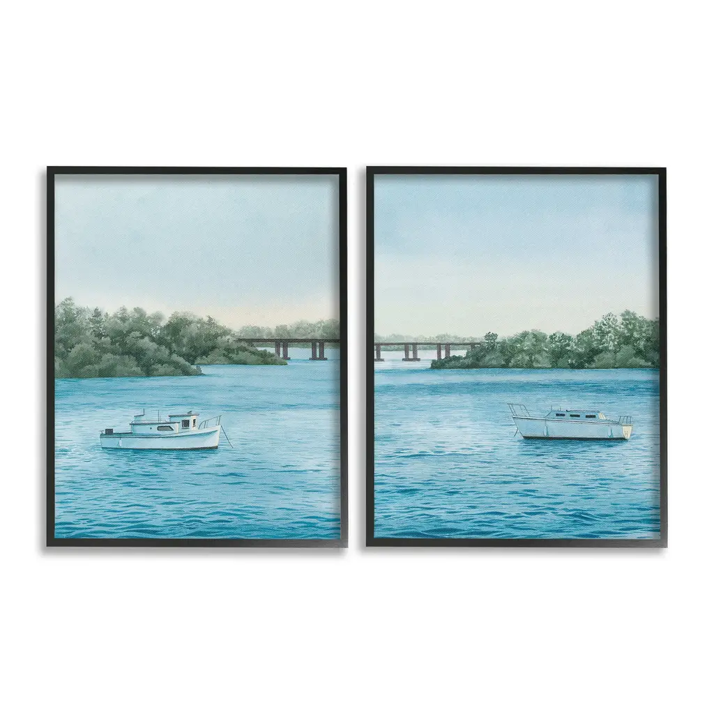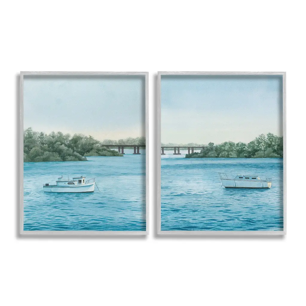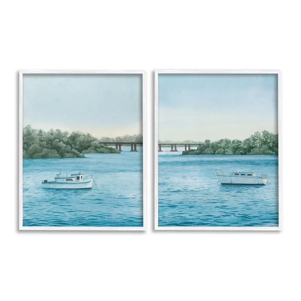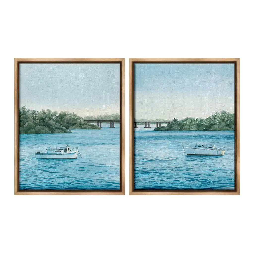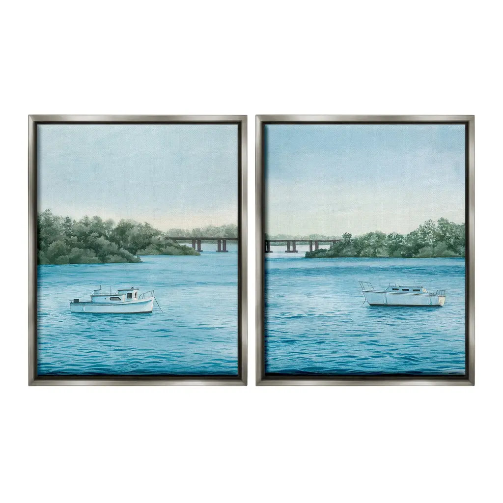 Elevate your home or office to the next level with Stupell Framed Floating Canvas Wall Art. Our premium hand-stretched canvas is mounted securely into a sturdy lightweight frame. The museum-style gap between the wrapped canvas and the box frame gives the illusion of floating artwork. Stupell Wall Art is made in the USA.Features: Dimensions: 2 Piece Set, Each Frame is 17 x 1.7 x 21Two Piece Floater Framed Canvas are available as 17x21 or 25x31 Panels. All Floater Frame Products have a 1.7" Depth.Wall Art is Ready to Hang with Hardware Free Hanging. No Installation required. For Easy Set Up Lean or Layer Artwork on Shelf or Against Wall. Artwork is Permently Fixed into the Frame.Our elevated 1.7" Thick Floating Frame is the perfect complement to our canvas style Wall Art. We use only the highest quality inks in house with industry leading printing solutions. Canvas is hand stretched over a durable wood foundation and then mounted securly into a Modern Box Frame. Made in the USA.Artwork Relates To: Boat, Water, Waterfront, Dinghy, Watercraft, Beach, Lake, Ocean, Coastal, Nautical, BridgeDesign by Grace Popp