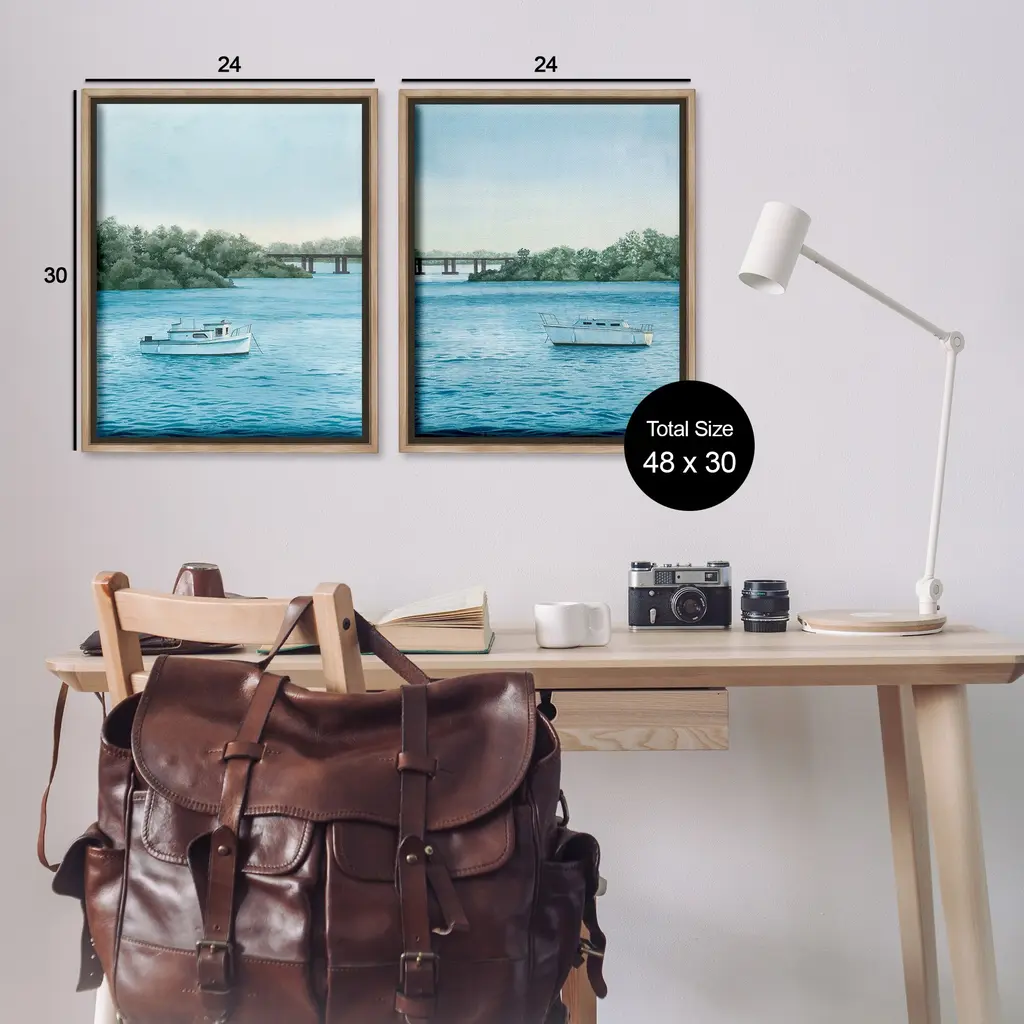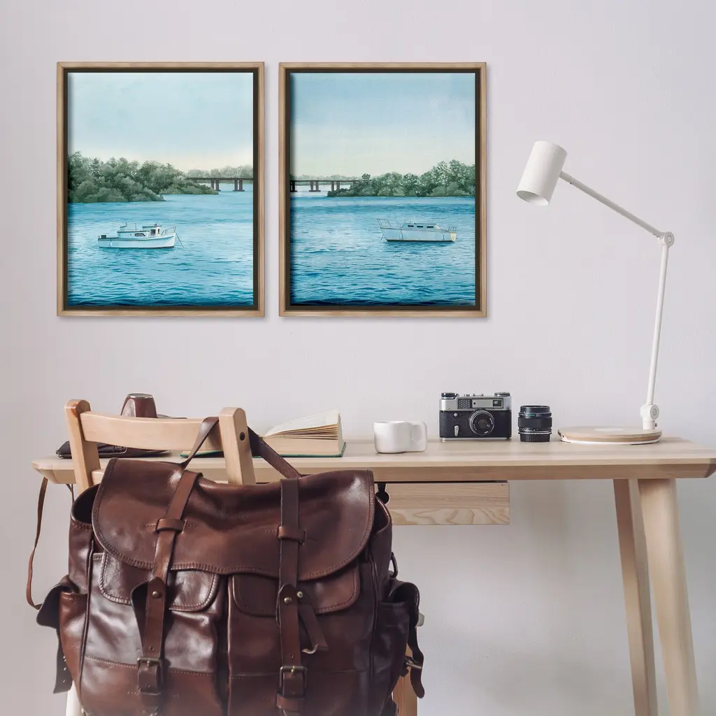Elevate your home or office to the next level with Stupell Framed Floating Canvas Wall Art. Our premium hand-stretched canvas is mounted securely into a sturdy lightweight frame. The museum-style gap between the wrapped canvas and the box frame gives the illusion of floating artwork. Stupell Wall Art is made in the USA.Features: Dimensions: 2 Piece Set, Each Frame is 17 x 1.7 x 21Two Piece Floater Framed Canvas are available as 17x21 or 25x31 Panels. All Floater Frame Products have a 1.7" Depth.Wall Art is Ready to Hang with Hardware Free Hanging. No Installation required. For Easy Set Up Lean or Layer Artwork on Shelf or Against Wall. Artwork is Permently Fixed into the Frame.Our elevated 1.7" Thick Floating Frame is the perfect complement to our canvas style Wall Art. We use only the highest quality inks in house with industry leading printing solutions. Canvas is hand stretched over a durable wood foundation and then mounted securly into a Modern Box Frame. Made in the USA.Artwork Relates To: Boat, Water, Waterfront, Dinghy, Watercraft, Beach, Lake, Ocean, Coastal, Nautical, BridgeDesign by Grace Popp