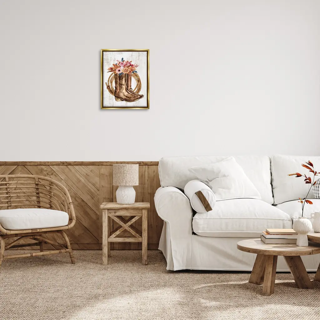 Elevate your home or office to the next level with Stupell Framed Floating Canvas Wall Art. Our premium hand-stretched canvas is mounted securely into a sturdy lightweight frame. The museum-style gap between the wrapped canvas and the box frame gives the illusion of floating artwork. Stupell Wall Art is made in the USA.Features: Dimensions: 17 x 1.7 x 21 Frame, 16 x 1.5 x 20 Canvas ArtFloating Frame Canvas Products are available in sizes 17"x21" and 25"x31". All Floating Frame Canvas Products have a 1.7" Depth.Wall Art is Ready to Hang with Hardware Free Hanging. No Installation required. For Easy Set Up Lean or Layer Artwork on Shelf or Against Wall. Artwork is Permently Fixed into the Frame.Our elevated 1.7" Thick Floating Frame is the perfect complement to our canvas style Wall Art. We use only the highest quality inks in house with industry leading printing solutions. Canvas is hand stretched over a durable wood foundation and then mounted securly into a Modern Box Frame. Made in the USA.Artwork Relates To: Equestrian, Rodeo, Country, Southwestern, Cowgirl, Boots, Floral, Flower, Rustic, BouquetDesign by Kim Allen