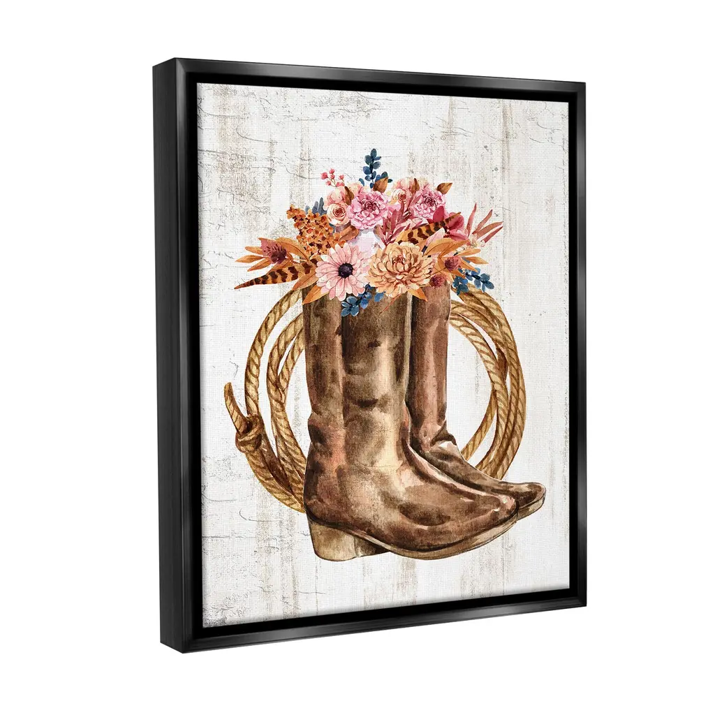 Elevate your home or office to the next level with Stupell Framed Floating Canvas Wall Art. Our premium hand-stretched canvas is mounted securely into a sturdy lightweight frame. The museum-style gap between the wrapped canvas and the box frame gives the illusion of floating artwork. Stupell Wall Art is made in the USA.Features: Dimensions: 17 x 1.7 x 21 Frame, 16 x 1.5 x 20 Canvas ArtFloating Frame Canvas Products are available in sizes 17"x21" and 25"x31". All Floating Frame Canvas Products have a 1.7" Depth.Wall Art is Ready to Hang with Hardware Free Hanging. No Installation required. For Easy Set Up Lean or Layer Artwork on Shelf or Against Wall. Artwork is Permently Fixed into the Frame.Our elevated 1.7" Thick Floating Frame is the perfect complement to our canvas style Wall Art. We use only the highest quality inks in house with industry leading printing solutions. Canvas is hand stretched over a durable wood foundation and then mounted securly into a Modern Box Frame. Made in the USA.Artwork Relates To: Equestrian, Rodeo, Country, Southwestern, Cowgirl, Boots, Floral, Flower, Rustic, BouquetDesign by Kim Allen