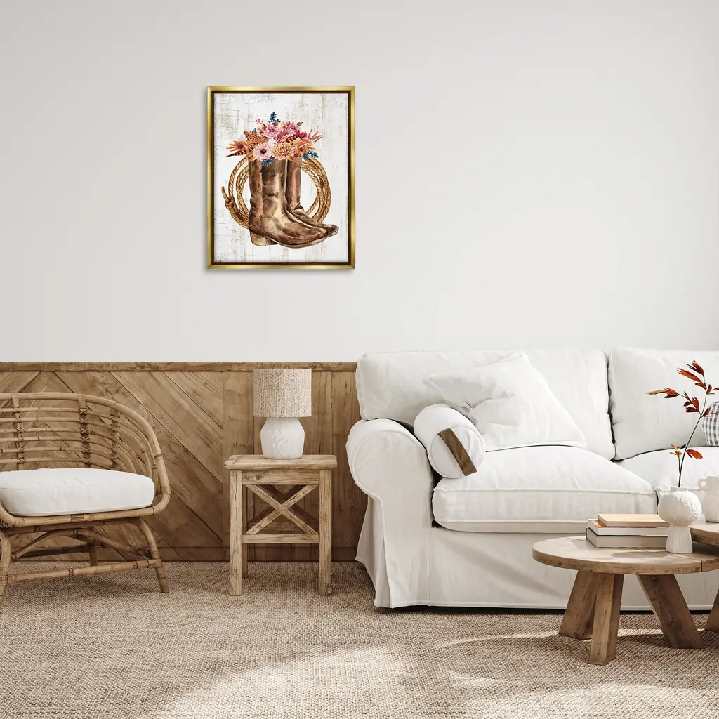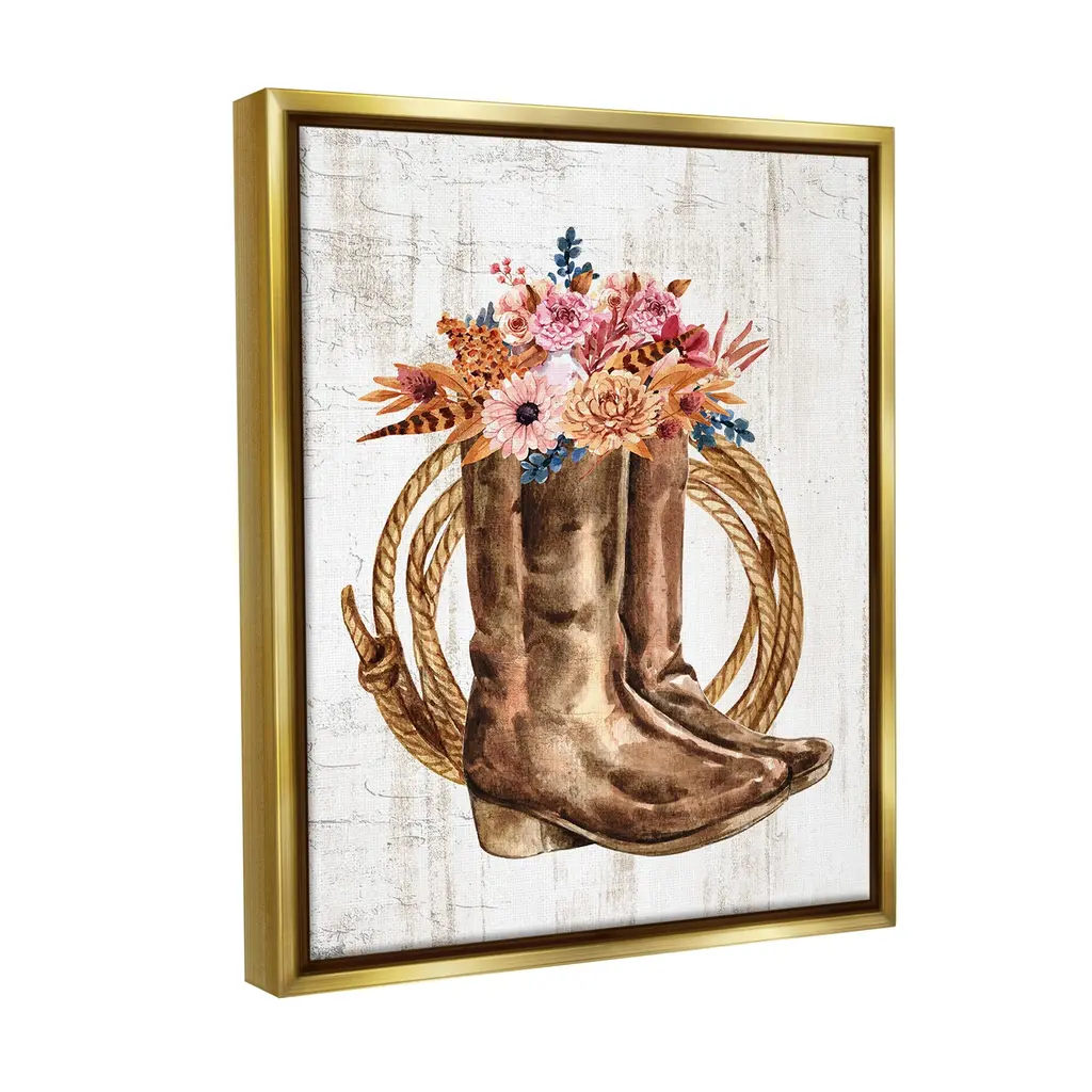 Elevate your home or office to the next level with Stupell Framed Floating Canvas Wall Art. Our premium hand-stretched canvas is mounted securely into a sturdy lightweight frame. The museum-style gap between the wrapped canvas and the box frame gives the illusion of floating artwork. Stupell Wall Art is made in the USA.Features: Dimensions: 17 x 1.7 x 21 Frame, 16 x 1.5 x 20 Canvas ArtFloating Frame Canvas Products are available in sizes 17"x21" and 25"x31". All Floating Frame Canvas Products have a 1.7" Depth.Wall Art is Ready to Hang with Hardware Free Hanging. No Installation required. For Easy Set Up Lean or Layer Artwork on Shelf or Against Wall. Artwork is Permently Fixed into the Frame.Our elevated 1.7" Thick Floating Frame is the perfect complement to our canvas style Wall Art. We use only the highest quality inks in house with industry leading printing solutions. Canvas is hand stretched over a durable wood foundation and then mounted securly into a Modern Box Frame. Made in the USA.Artwork Relates To: Equestrian, Rodeo, Country, Southwestern, Cowgirl, Boots, Floral, Flower, Rustic, BouquetDesign by Kim Allen