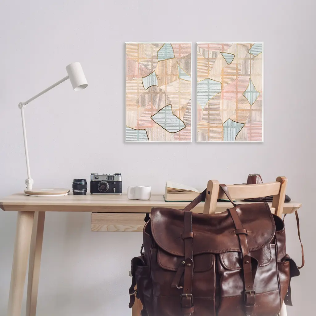 Fill any space with Stupell Wall Art Sets. Our wall plaques start as high-quality lithograph prints mounted on durable 0.5-inch thick MDF wood. Each piece is hand finished and comes with a fresh layer of white foil on the sides to give it a crisp, clean look. Plaques arrive ready to hang without installation and come with removable plastic corners to keep them from damage in transit. Stupell Wall Art is made in the USA.Features: Dimensions: 2 Piece Set, Each Panel is 10 x 0.5 x 15 InchesTwo Piece Wall Plaque Sets are available as 10"x15" or 13"x19" Panels. All Wall Art Plaques have a 0.5" Depth.Wall Art is Ready to Hang with Hardware Free Hanging. No installation required. For Easy Set Up Lean or Layer Artwork on Shelf or Against Wall.All of our wall plaques start off as high quality lithograph prints that are then mounted on durable 0.5 inch thick MDF wood. Each piece is hand finished and comes with a fresh layer of foil on the sides to give it a crisp clean look. Made In USA.Artwork Relates To: Abstract, Modern, Pattern, Geometric, StripesDesign by Vanna Lam