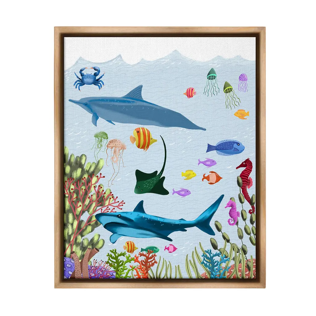 Elevate your home or office to the next level with Stupell Framed Floating Canvas Wall Art. Our premium hand-stretched canvas is mounted securely into a sturdy lightweight frame. The museum-style gap between the wrapped canvas and the box frame gives the illusion of floating artwork. Stupell Wall Art is made in the USA.Features: Dimensions: 17 x 1.7 x 21 Frame, 16 x 1.5 x 20 Canvas ArtFloating Frame Canvas Products are available in sizes 17"x21" and 25"x31". All Floating Frame Canvas Products have a 1.7" Depth.Wall Art is Ready to Hang with Hardware Free Hanging. No Installation required. For Easy Set Up Lean or Layer Artwork on Shelf or Against Wall. Artwork is Permently Fixed into the Frame.Our elevated 1.7" Thick Floating Frame is the perfect complement to our canvas style Wall Art. We use only the highest quality inks in house with industry leading printing solutions. Canvas is hand stretched over a durable wood foundation and then mounted securly into a Modern Box Frame. Made in the USA.Artwork Relates To: Animal, Sea Life, Fish, Shark, Nature, Reef, Sea, Water, Whale, Aquatic, UnderwaterDesign by Regina Moore