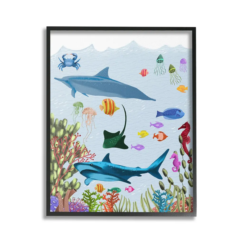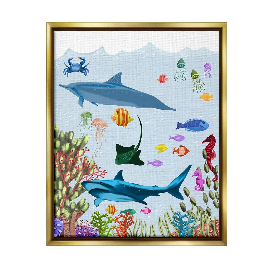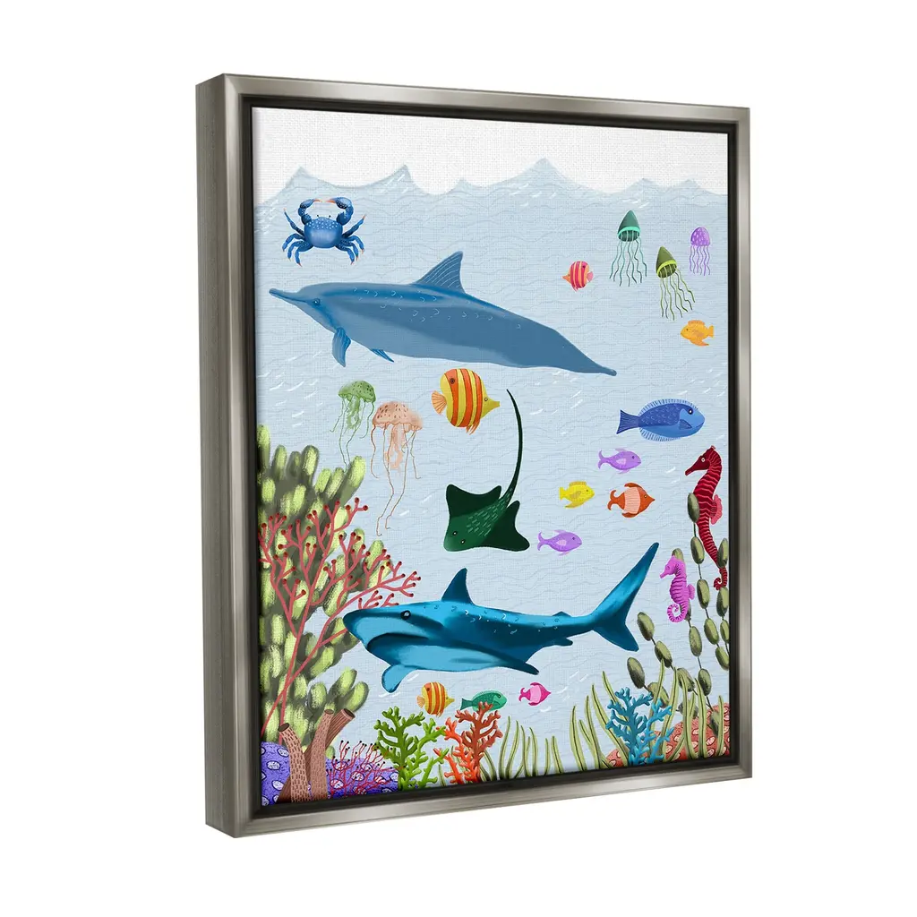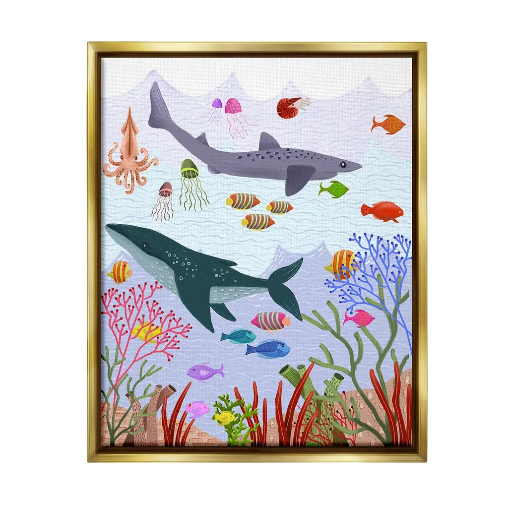Elevate your home or office to the next level with Stupell Framed Floating Canvas Wall Art. Our premium hand-stretched canvas is mounted securely into a sturdy lightweight frame. The museum-style gap between the wrapped canvas and the box frame gives the illusion of floating artwork. Stupell Wall Art is made in the USA.Features: Dimensions: 17 x 1.7 x 21 Frame, 16 x 1.5 x 20 Canvas ArtFloating Frame Canvas Products are available in sizes 17"x21" and 25"x31". All Floating Frame Canvas Products have a 1.7" Depth.Wall Art is Ready to Hang with Hardware Free Hanging. No Installation required. For Easy Set Up Lean or Layer Artwork on Shelf or Against Wall. Artwork is Permently Fixed into the Frame.Our elevated 1.7" Thick Floating Frame is the perfect complement to our canvas style Wall Art. We use only the highest quality inks in house with industry leading printing solutions. Canvas is hand stretched over a durable wood foundation and then mounted securly into a Modern Box Frame. Made in the USA.Artwork Relates To: Animal, Sea Life, Fish, Shark, Nature, Reef, Sea, Water, Whale, Aquatic, UnderwaterDesign by Regina Moore