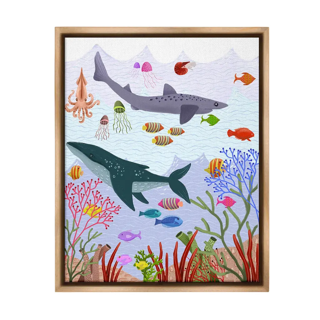Elevate your home or office to the next level with Stupell Framed Floating Canvas Wall Art. Our premium hand-stretched canvas is mounted securely into a sturdy lightweight frame. The museum-style gap between the wrapped canvas and the box frame gives the illusion of floating artwork. Stupell Wall Art is made in the USA.Features: Dimensions: 17 x 1.7 x 21 Frame, 16 x 1.5 x 20 Canvas ArtFloating Frame Canvas Products are available in sizes 17"x21" and 25"x31". All Floating Frame Canvas Products have a 1.7" Depth.Wall Art is Ready to Hang with Hardware Free Hanging. No Installation required. For Easy Set Up Lean or Layer Artwork on Shelf or Against Wall. Artwork is Permently Fixed into the Frame.Our elevated 1.7" Thick Floating Frame is the perfect complement to our canvas style Wall Art. We use only the highest quality inks in house with industry leading printing solutions. Canvas is hand stretched over a durable wood foundation and then mounted securly into a Modern Box Frame. Made in the USA.Artwork Relates To: Animal, Sea Life, Fish, Shark, Nature, Reef, Sea, Water, Whale, Aquatic, UnderwaterDesign by Regina Moore