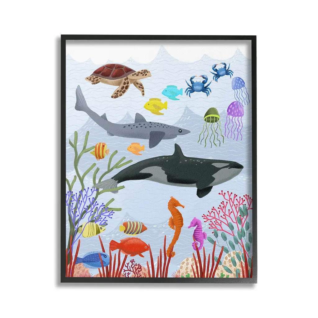 Elevate your home or office to the next level with Stupell Framed Floating Canvas Wall Art. Our premium hand-stretched canvas is mounted securely into a sturdy lightweight frame. The museum-style gap between the wrapped canvas and the box frame gives the illusion of floating artwork. Stupell Wall Art is made in the USA.Features: Dimensions: 17 x 1.7 x 21 Frame, 16 x 1.5 x 20 Canvas ArtFloating Frame Canvas Products are available in sizes 17"x21" and 25"x31". All Floating Frame Canvas Products have a 1.7" Depth.Wall Art is Ready to Hang with Hardware Free Hanging. No Installation required. For Easy Set Up Lean or Layer Artwork on Shelf or Against Wall. Artwork is Permently Fixed into the Frame.Our elevated 1.7" Thick Floating Frame is the perfect complement to our canvas style Wall Art. We use only the highest quality inks in house with industry leading printing solutions. Canvas is hand stretched over a durable wood foundation and then mounted securly into a Modern Box Frame. Made in the USA.Artwork Relates To: Animal, Sea Life, Fish, Shark, Nature, Reef, Sea, Water, Whale, Aquatic, UnderwaterDesign by Regina Moore