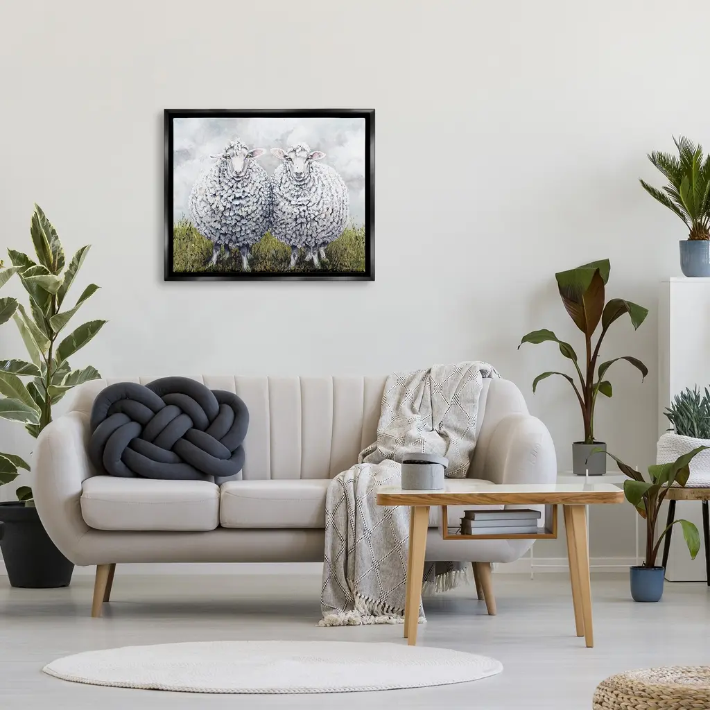 Elevate your home or office to the next level with Stupell Framed Floating Canvas Wall Art. Our premium hand-stretched canvas is mounted securely into a sturdy lightweight frame. The museum-style gap between the wrapped canvas and the box frame gives the illusion of floating artwork. Stupell Wall Art is made in the USA.Features: Dimensions: 21 x 1.7 x 17 Frame, 20 x 1.5 x 16 Canvas ArtFloating Frame Sizes Include Standard: 21 x 1.7 x 17 Oversized: 31 x 1.7 x 25Wall Art is Ready to Hang with Hardware Free Hanging. No installation required. For Easy Set Up Lean or Layer Artwork on Shelf or Against Wall.Our elevated 1.7" Thick Floating Frame is the perfect complement to our canvas style Wall Art. We use only the highest quality inks in house with industry leading printing solutions. Canvas is hand stretched over a durable wood foundation and then mounted securly into a Modern Box Frame. Made in the USA.Artwork Relates To: Animal, Mammal, Sheep, Farm, Landscape, CloudsDesign by Maggie Vandewalle