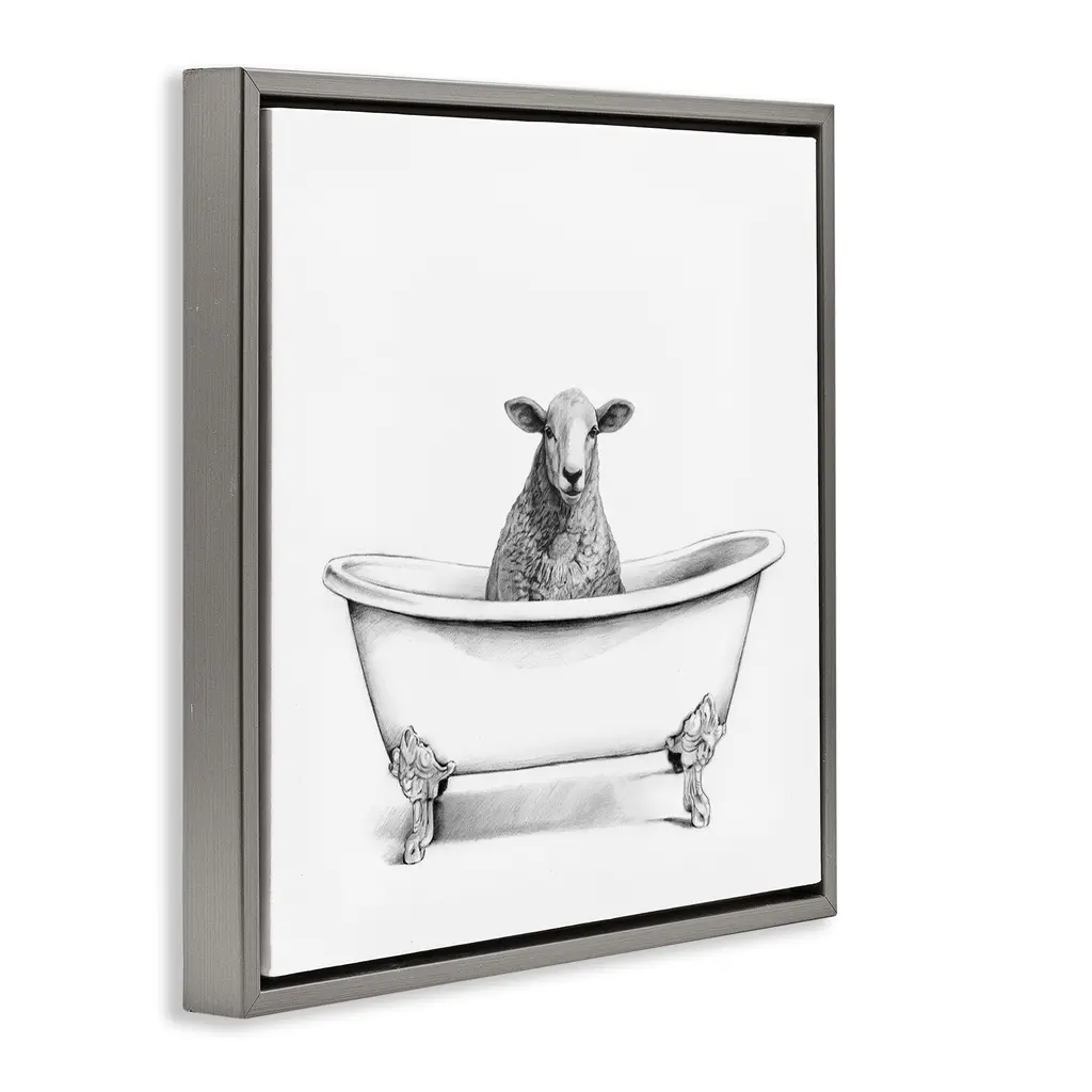 Elevate your home or office to the next level with Stupell Framed Floating Canvas Wall Art. Our premium hand-stretched canvas is mounted securely into a sturdy lightweight frame. The museum-style gap between the wrapped canvas and the box frame gives the illusion of floating artwork. Stupell Wall Art is made in the USA.Features: Dimensions: 18 x 1.7 x 18 Frame, 17 x 1.5 x 17 Canvas ArtFloating Frame Canvas Products are available in sizes 18"x18" and 25"x25". All Floating Frame Canvas Products have a 1.7" Depth.Wall Art is Ready to Hang with Hardware Free Hanging. No Installation required. For Easy Set Up Lean or Layer Artwork on Shelf or Against Wall. Artwork is Permently Fixed into the Frame.Our elevated 1.7" Thick Floating Frame is the perfect complement to our canvas style Wall Art. We use only the highest quality inks in house with industry leading printing solutions. Canvas is hand stretched over a durable wood foundation and then mounted securly into a Modern Box Frame. Made in the USA.Artwork Relates To: Bathroom, Bathtub, Animal, Lamb, SheepDesign by Victoria Borges