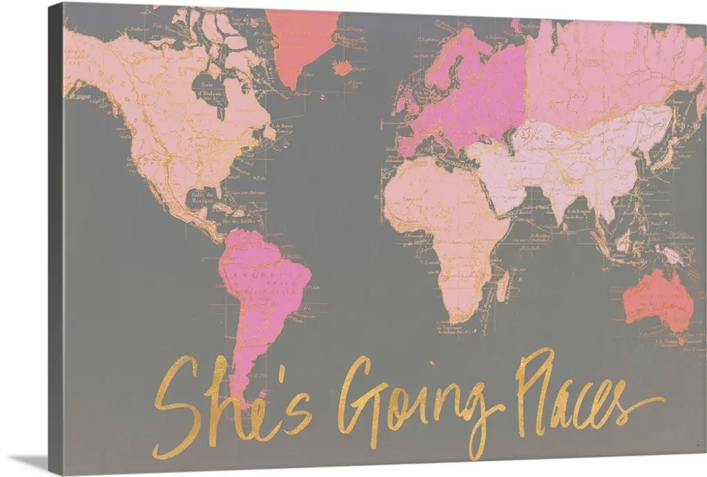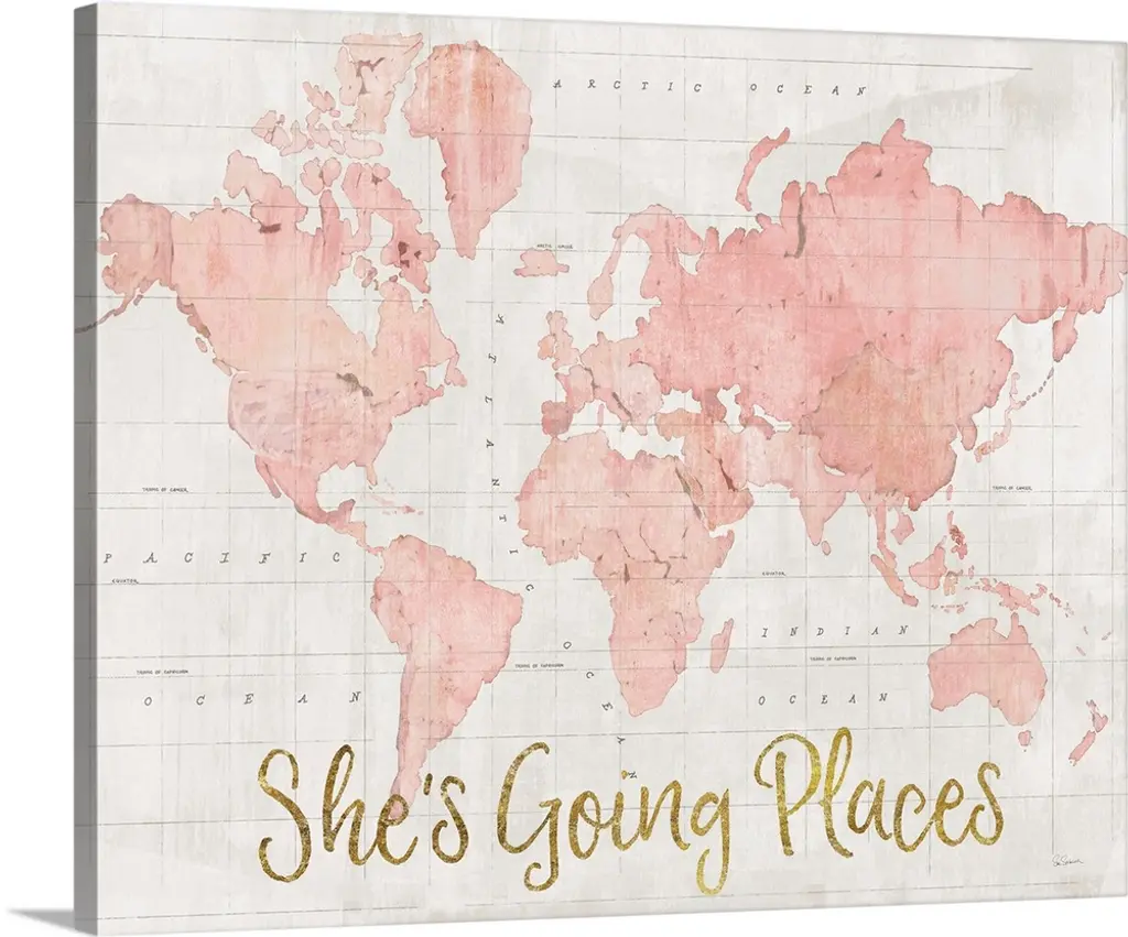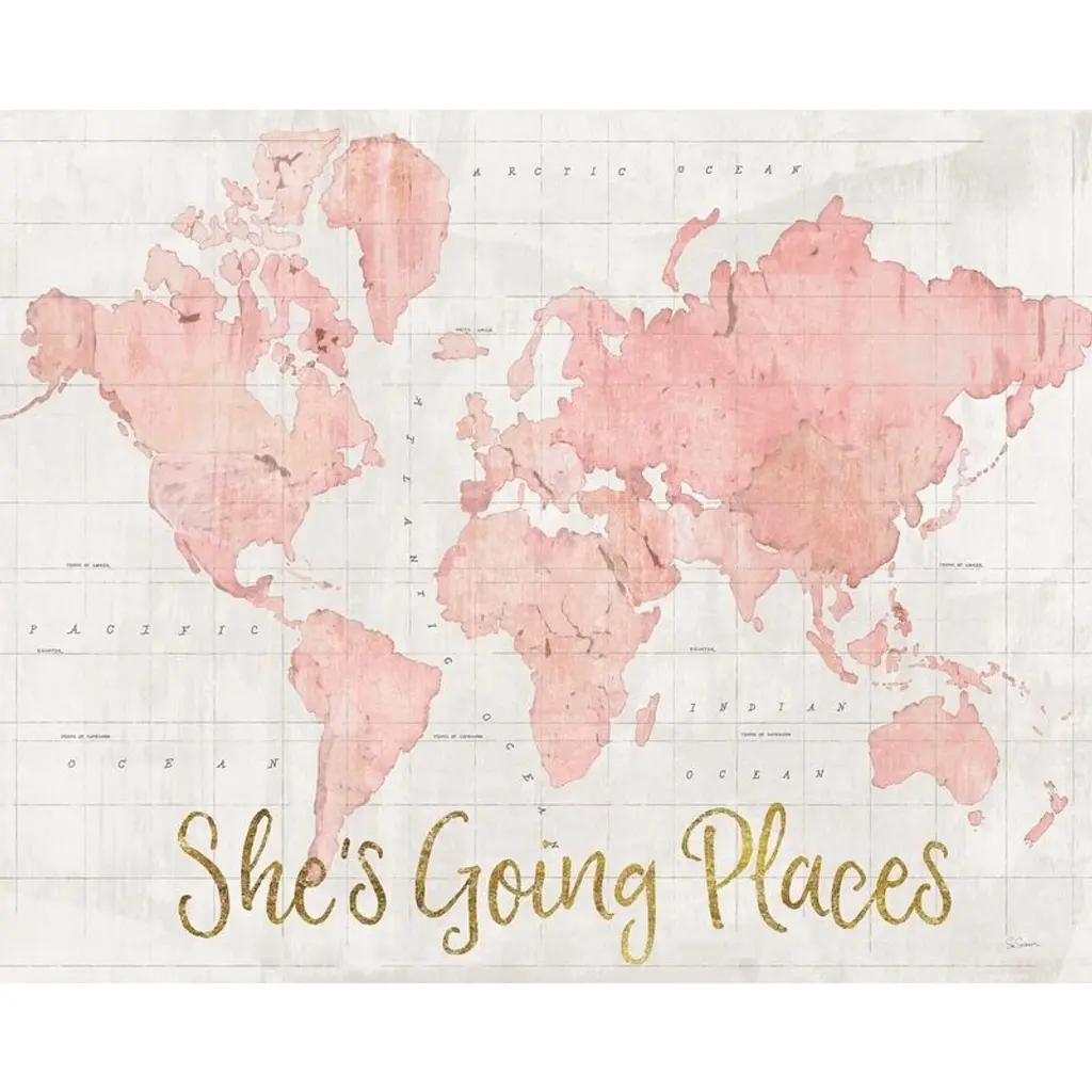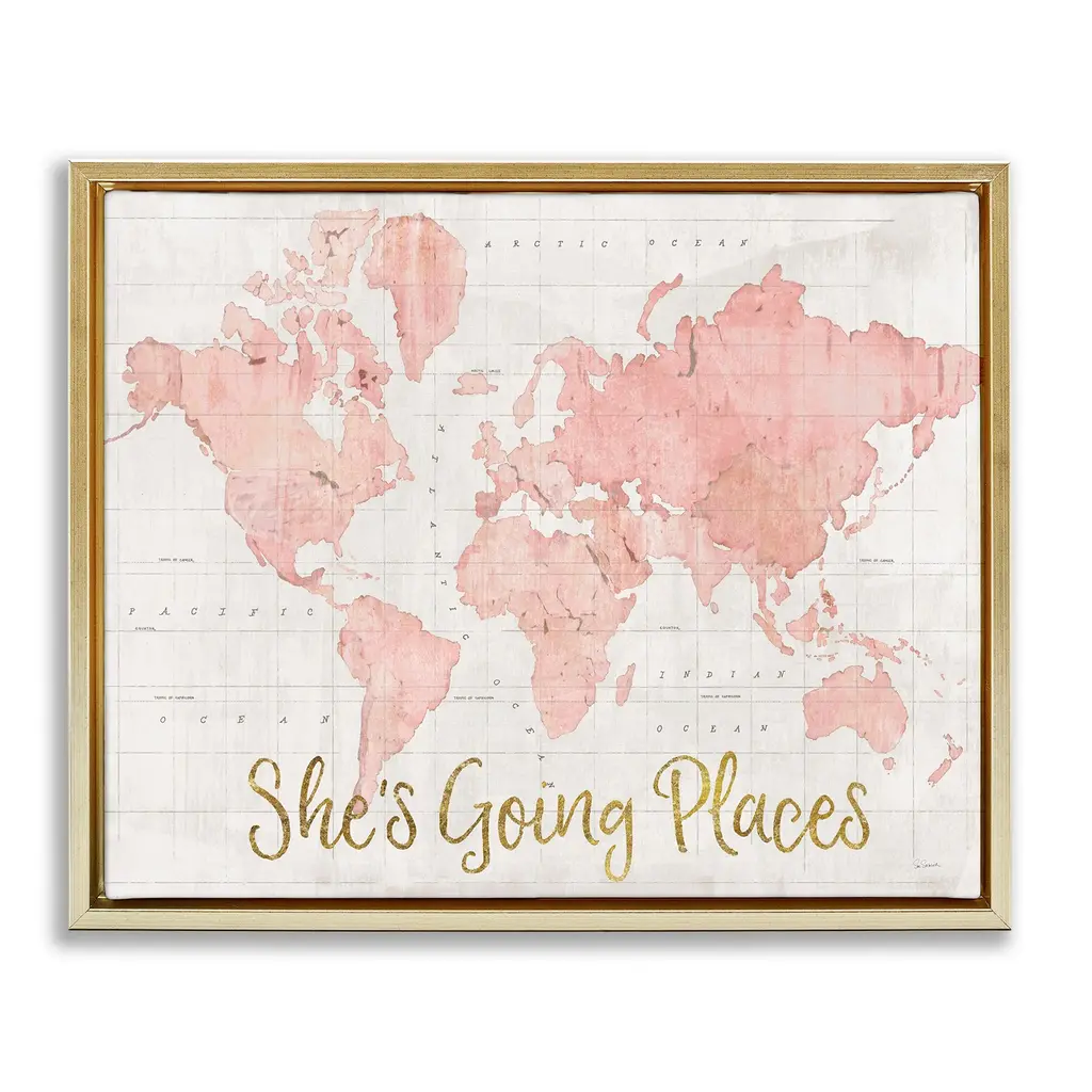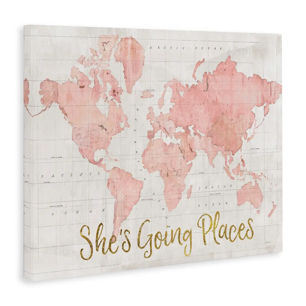 Stupell She's Going Places Quote Pink Watercolor World Map Canvas Wall Art - 16 X 20