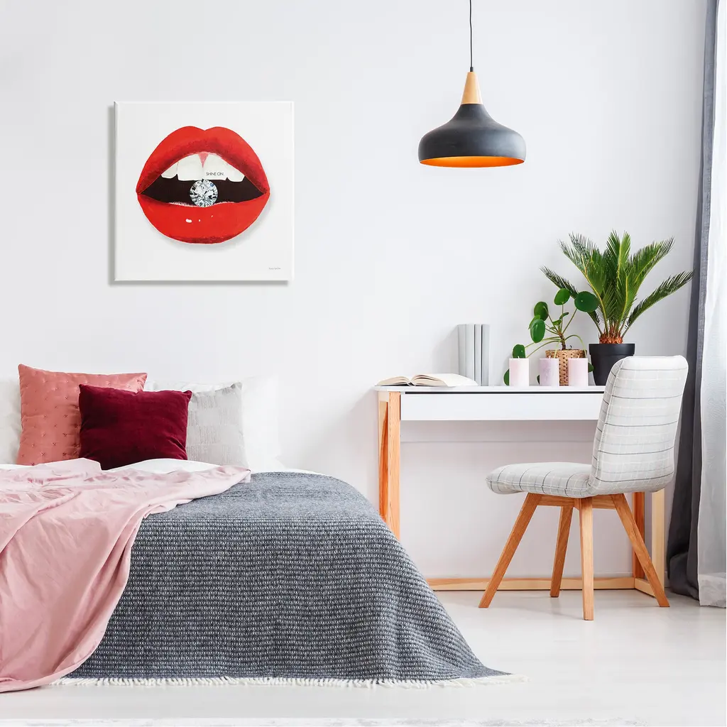 We create our stretched canvas to the highest standards. Using only the highest quality inks and canvas on Mimaki printers, we hand-cut and stretch each piece over a 1.5-inch thick wooden frame for hanging. As a result, the art comes ready to hang on the sturdy ledge with no installation required. Stupell Wall Art is made in the USA.Features: Dimensions: 17 x 1.5 x 17 InchesStretched Canvas Sizes Include Standard: 17 x 1.5 x 17 Large: 24 x 1.5 x 24 X-Large: 30 x 1.5 x 30 Oversized: 36 x 1.5 x 36Wall Art is Ready to Hang with Hardware Free Hanging. No installation required. For Easy Set Up Lean or Layer Artwork on Shelf or Against Wall.Our stretched canvas is created with the highest standards. We use only the highest quality inks and canvas on our in house Mimaki printers, and then hand cut and stretch each piece over a 1.5 inch thick wooden frame for hanging. Made In USA.Artwork Relates To: Diamond, Gemstone, Jewelry, Mouth, Person, Girl, Lips, Lipstick, Shine OnDesign by Mercedes Lopez Charro