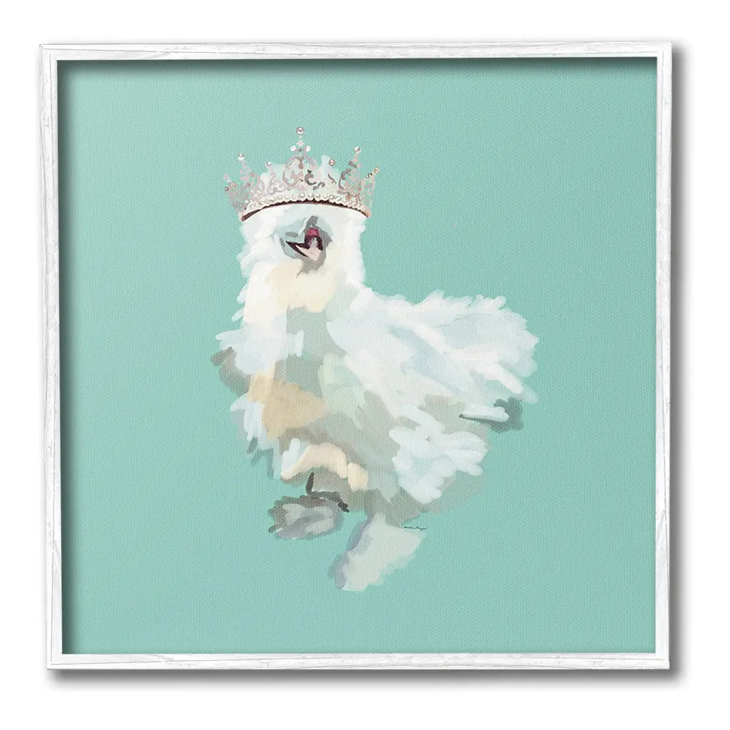 Our wall plaques start as high-quality lithograph prints mounted on durable 0.5-inch thick MDF wood. Each piece is hand finished and comes with a fresh layer of white foil on the sides to give it a crisp, clean look. Plaques arrive ready to hang without installation and come with removable plastic corners to keep them from damage in transit. Stupell Wall Art is made in the USA.Features: Dimensions: 12 x 0.5 x 12 InchesWall Art is Ready to Hang with Hardware Free Hanging. No installation required. For Easy Set Up Lean or Layer Artwork on Shelf or Against Wall.All of our wall plaques start off as high quality lithograph prints that are then mounted on durable 0.5 inch thick MDF wood. Each piece is hand finished and comes with a fresh layer of foil on the sides to give it a crisp clean look. Made In USA.Artwork Relates To: Animal, Tiara, Crown, Princess, Chicken, Hen, Bird, SilkieDesign by Amelia Noyes