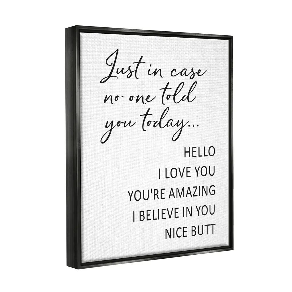 Elevate your home or office to the next level with Stupell Framed Floating Canvas Wall Decor. Our premium hand stretched canvas is mounted securely into a sturdy lightweight frame. The museum style gap between wrapped canvas and box frame gives the illusion of floating artwork. Features: Wall Art is Ready to Hang - No Installation or Hardware Needed. For Easy Set Up Lean or Layer Artwork on Shelf or Against Wall.Our elevated 1.5" Thick Floating Frame is the perfect complement to our canvas style Wall Art. We use only the highest quality inks in house with industry leading printing solutions. Canvas is hand stretched over a durable wood foundation and then mounted securely into a Modern Box Frame. Made in the USA.Artwork Relates To: Humor; Typography; CasualDesign by Lettered and Lined