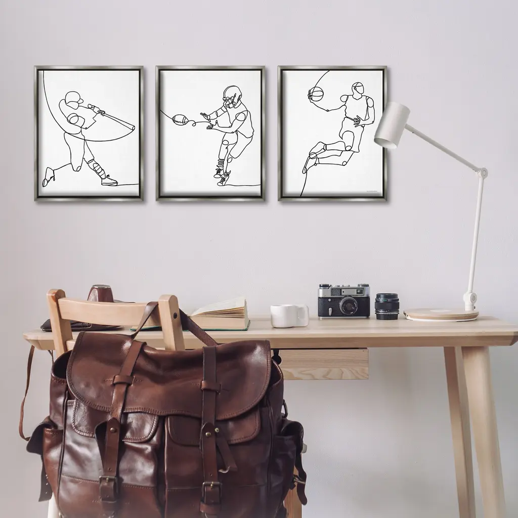 Elevate your home or office to the next level with Stupell Framed Floating Canvas Wall Art. Our premium hand-stretched canvas is mounted securely into a sturdy lightweight frame. The museum-style gap between the wrapped canvas and the box frame gives the illusion of floating artwork. Stupell Wall Art is made in the USA.Features: Dimensions: 3 Piece Set, Each Frame is 17 x 1.7 x 21Three Piece Floater Framed Canvas are available as 17x21 or 25x31 Panels. All Floater Frame Products have a 1.7" Depth.Wall Art is Ready to Hang with Hardware Free Hanging. No Installation required. For Easy Set Up Lean or Layer Artwork on Shelf or Against Wall. Artwork is Permently Fixed into the Frame.Our elevated 1.7" Thick Floating Frame is the perfect complement to our canvas style Wall Art. We use only the highest quality inks in house with industry leading printing solutions. Canvas is hand stretched over a durable wood foundation and then mounted securly into a Modern Box Frame. Made in the USA.Artwork Relates To: Sports, Person, Baseball, Football, Basketball, MinimalDesign by Kamdon Kreations