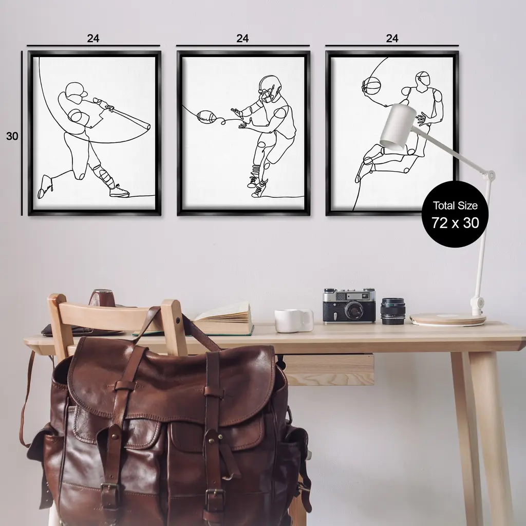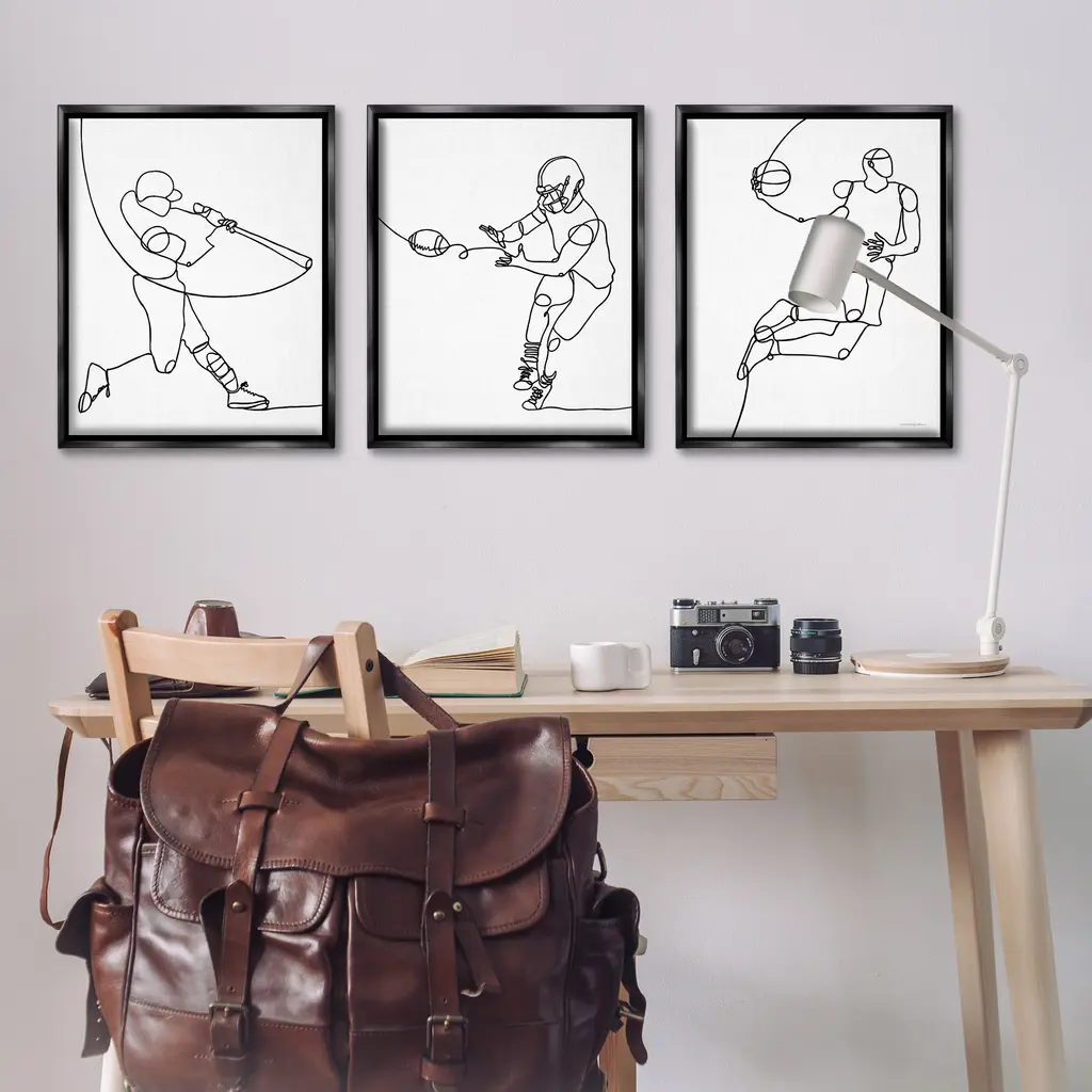 Elevate your home or office to the next level with Stupell Framed Floating Canvas Wall Art. Our premium hand-stretched canvas is mounted securely into a sturdy lightweight frame. The museum-style gap between the wrapped canvas and the box frame gives the illusion of floating artwork. Stupell Wall Art is made in the USA.Features: Dimensions: 3 Piece Set, Each Frame is 17 x 1.7 x 21Three Piece Floater Framed Canvas are available as 17x21 or 25x31 Panels. All Floater Frame Products have a 1.7" Depth.Wall Art is Ready to Hang with Hardware Free Hanging. No Installation required. For Easy Set Up Lean or Layer Artwork on Shelf or Against Wall. Artwork is Permently Fixed into the Frame.Our elevated 1.7" Thick Floating Frame is the perfect complement to our canvas style Wall Art. We use only the highest quality inks in house with industry leading printing solutions. Canvas is hand stretched over a durable wood foundation and then mounted securly into a Modern Box Frame. Made in the USA.Artwork Relates To: Sports, Person, Baseball, Football, Basketball, MinimalDesign by Kamdon Kreations